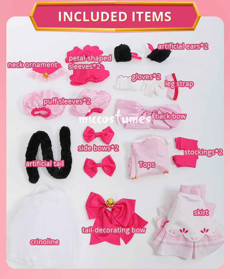 | Included Items | top *1, dress *1, lantern sleeve *2, choker*1, hand sleeve *2, side waist bow *2, ear headwear *2, gloves *2, socks *2, tail *1, leg band *1, middle bow *1, tail bow *1, bustle *1 |