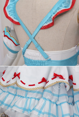 The costume includes dress, vest, shorts, socks*2, wrist accessory*2, arm accessory*2, neck accessory*1, tattoo sticker*1, head accessory*4(white and blue), hair clip*1. It is made of satin, printed fabric.