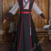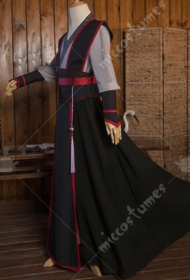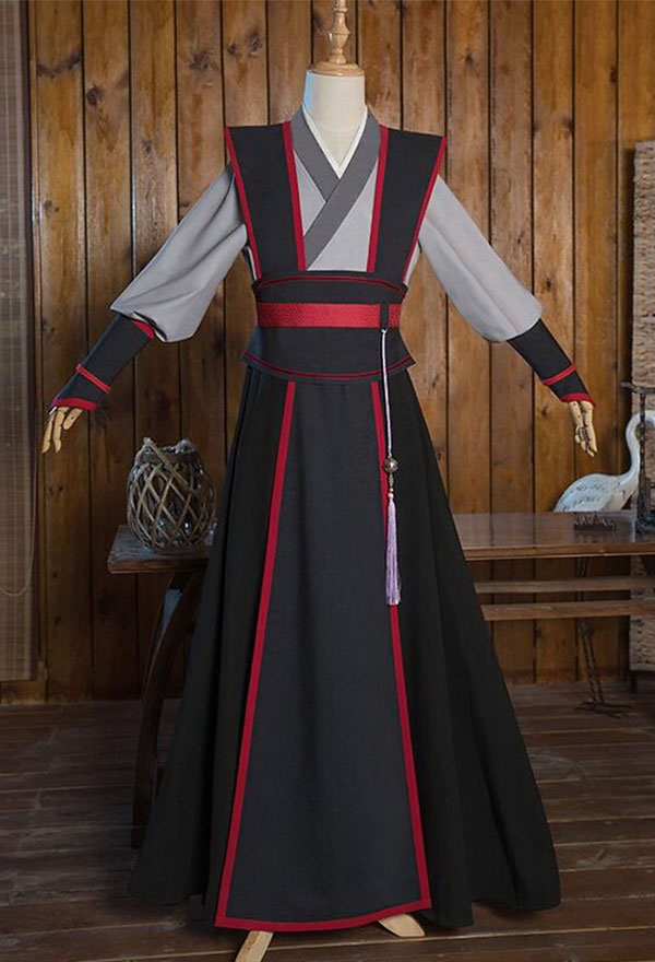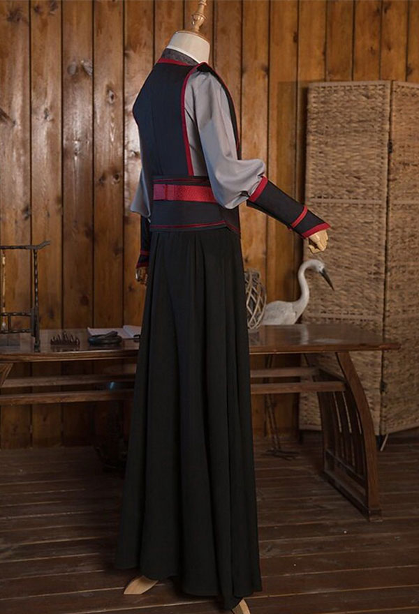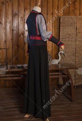 This costume includes inner clothes, pants, coat, belt, red waistband, belt decoration, armband*2, hair band and front dress piece. It's made of chiffon, satin, linen and tencel fabric.