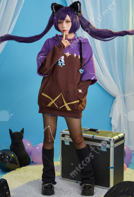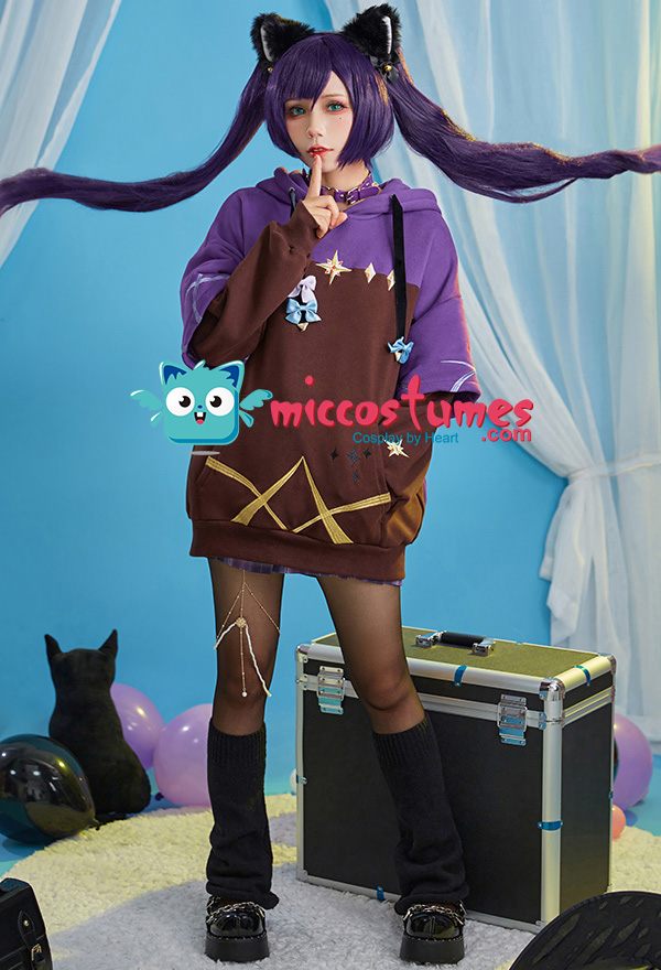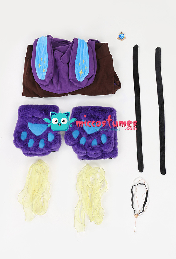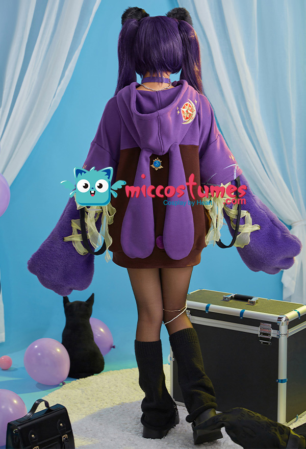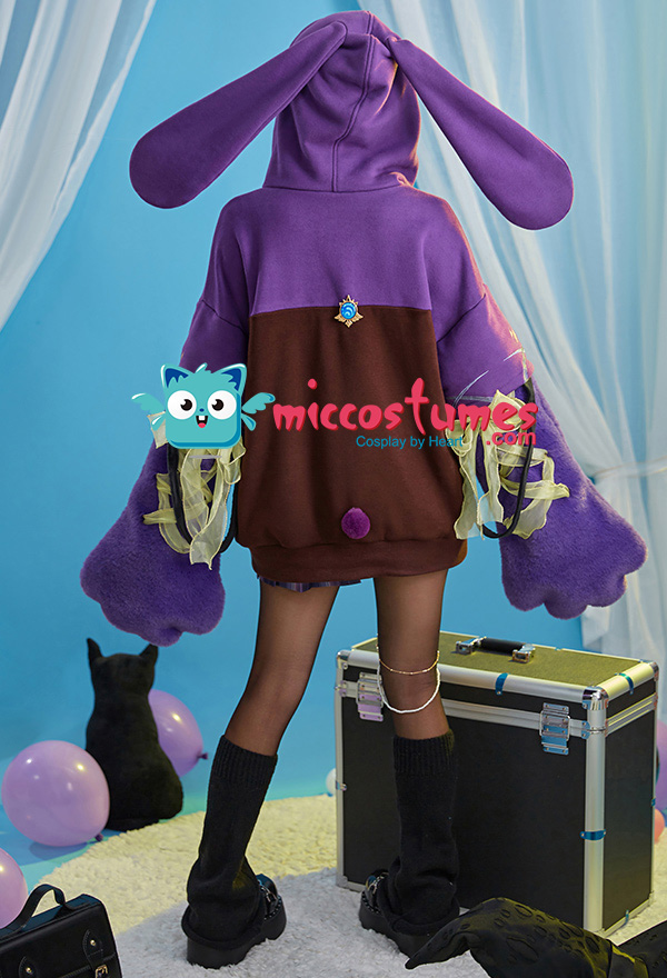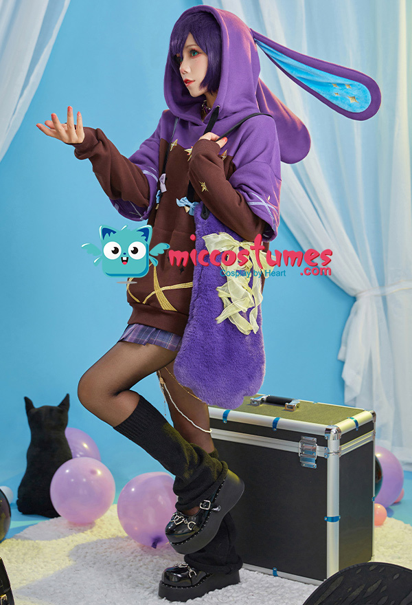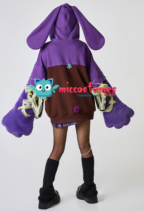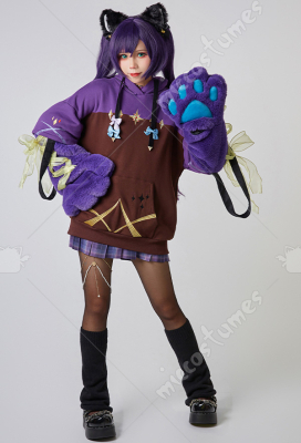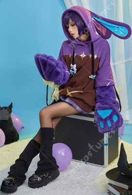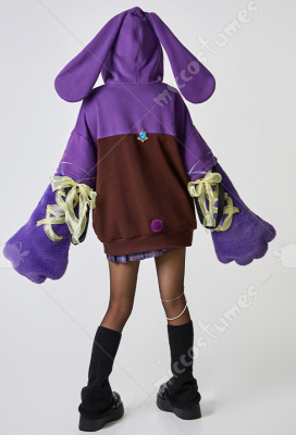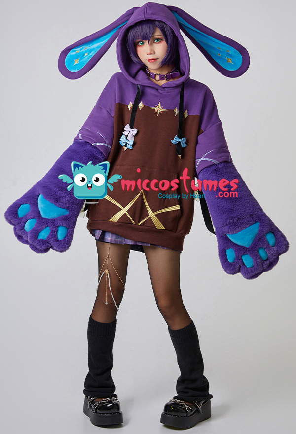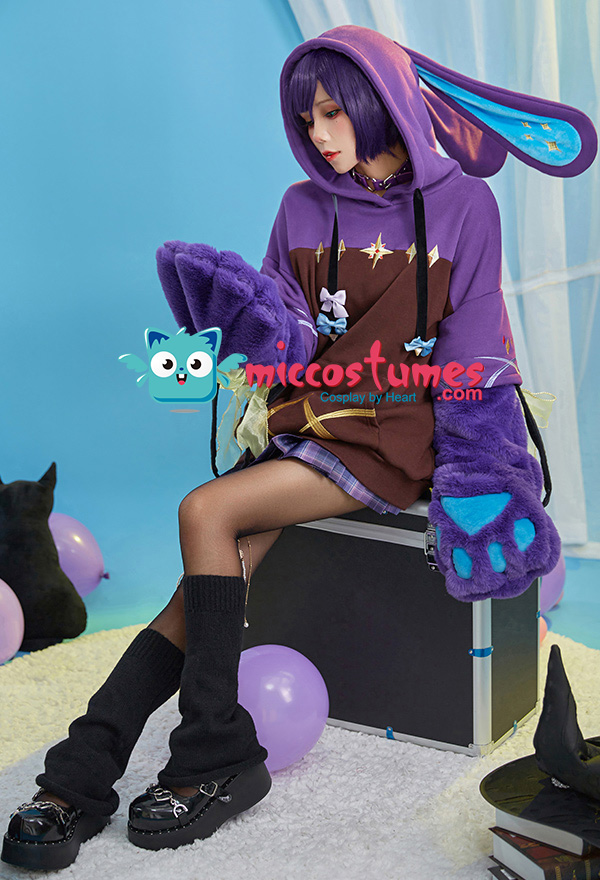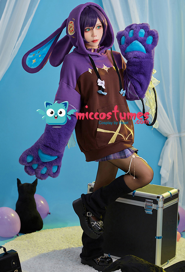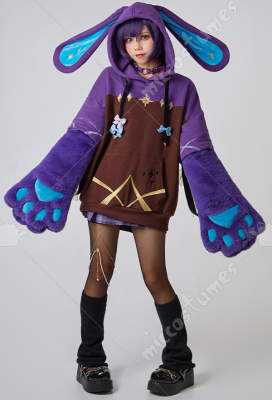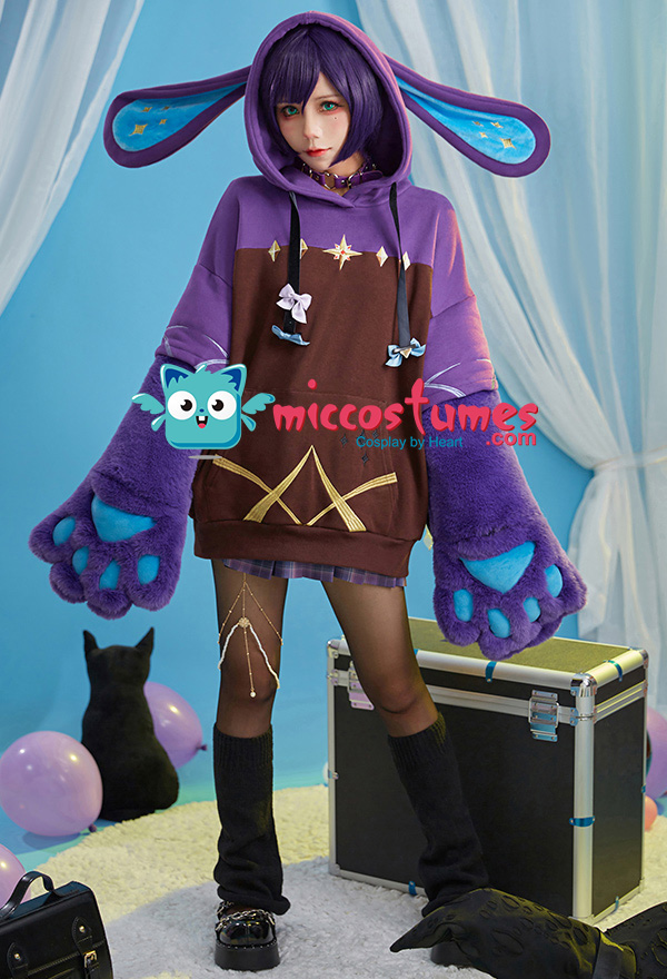 Design Details: 1. Inspiration Source – The hoodie is inspired from Genshin Impact Mona with bunny as the prototype. With the bunny ear hood, the beautiful star pattern and the furry paw gloves, it looks cute and cool. The main color is the blue-violet color scheme that is very characteristic of Mona. In addition, there are many delicate gold thread embroideries on the hoodie. There is a cute purple fur ball tail on the back of the hoodie. Comes with a Vision brooch. 2. Special Design – The detachable bag design furry paw is the highlight of this hoodie. The two long-sleeved paw gloves can be detached and used as two bags. 3. Soft & Cozy Materials – The main hoodie is made of high-quality sweatshirt fabric, which is breathable, light and comfortable. It’s specially suited for autumn and spring. The paw gloves are made of furry material, touching soft and comfortable. 4. Notes – There may be some floating fluff on the surface of the hoodie. We suggest you clean the stains with wet towel as soon as possible once your hoodie is stained. Please do not wash frequently. It cannot be machine washed. Please do not add any chemical products when washing. For the Paw Gloves Design: 1. The paws are filled with cotton cushions and provided with heart designs to offer a cute and real look. 2. Hidden zippers are provided on the sleeves and inside the gloves’ wrists. You can remove the gloves via the zippers on the sleeves or unzip the gloves’ wrists to let your hands free. 3. The strap on the gloves can be a fashion icon and can also be used to sling the bag design gloves over your shoulders. 4. The material used for gloves is super-soft and cozy to keep your hands always in a warm state.