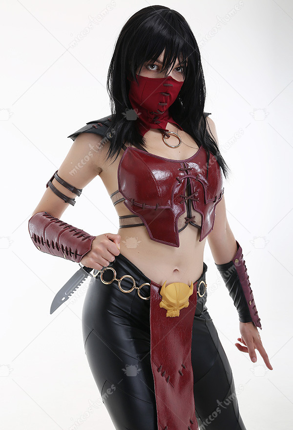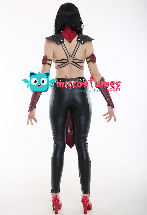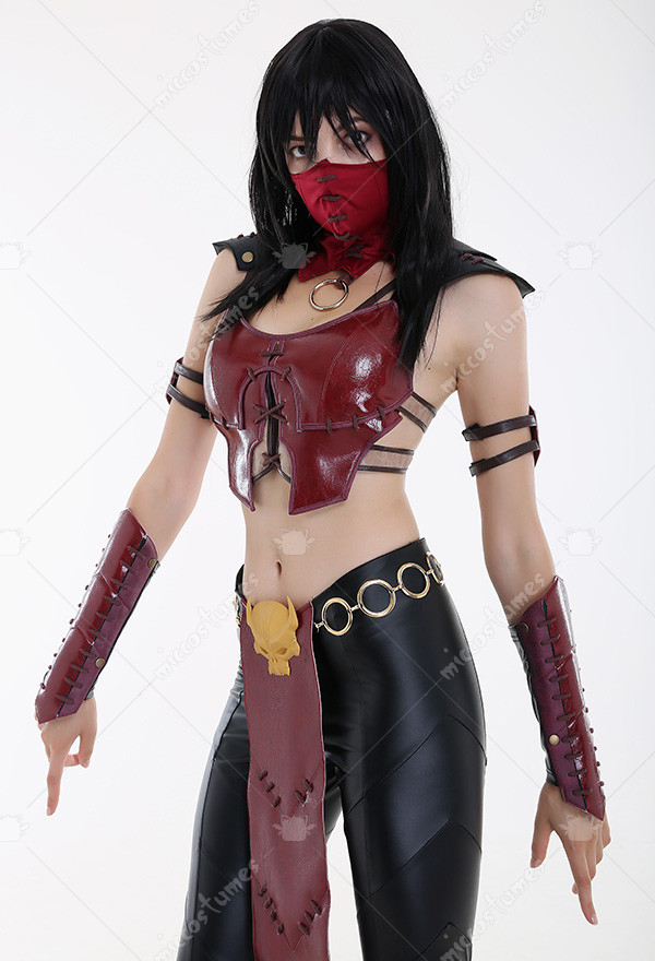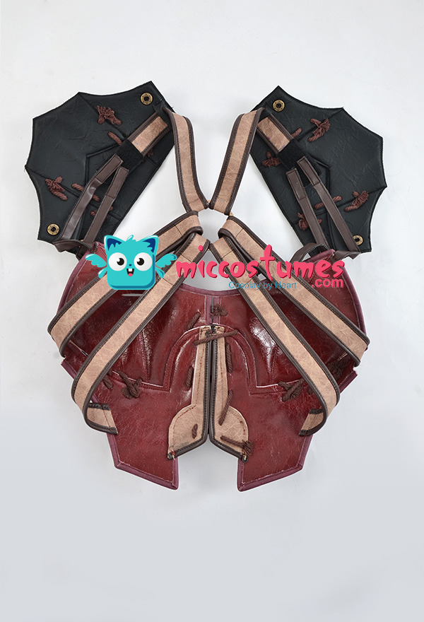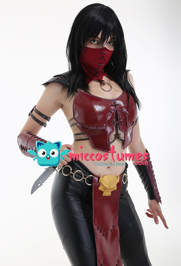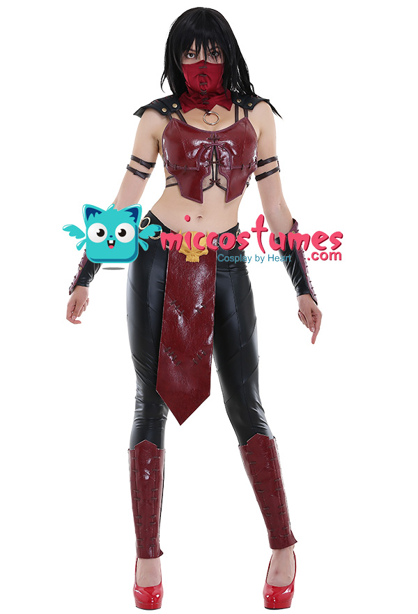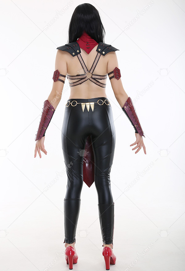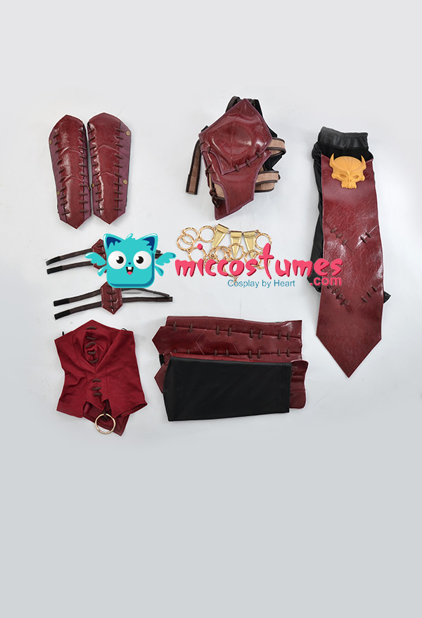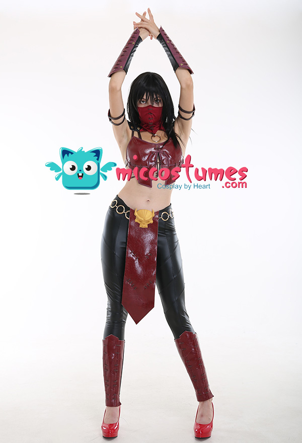 The costume includes corset, mask, pants, wrist guard*2, leg warmer*2, armband*2, waist jewellery*1. It is made of spandex, PU leather, PVC.