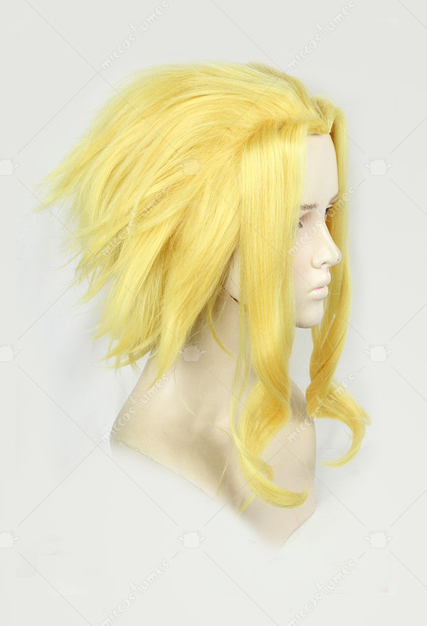 The wig's both sides of the bangs extend to about 10cm below the chin, you can secure the wig with a bit wax. It is made of high-temperature resistant synthetic fiber which can sustain a temperature of 180-200 degrees.