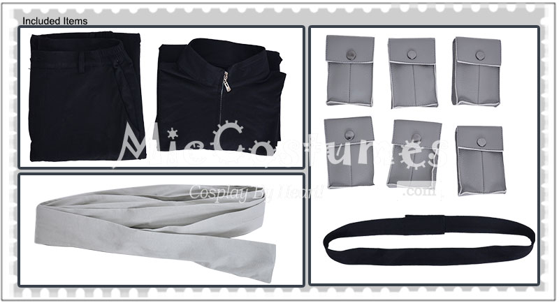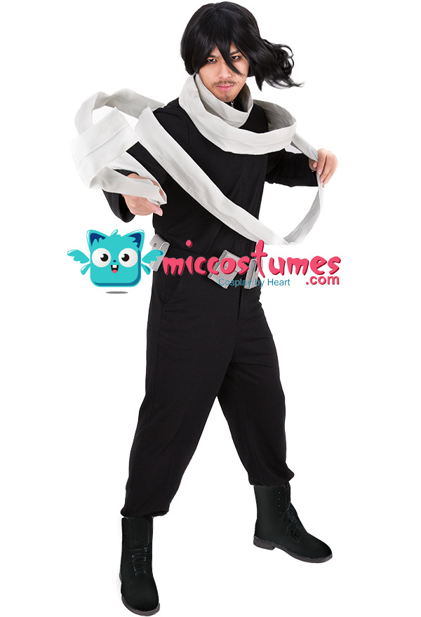 Includes: upper garment, pants, scarf and belt Materials: cotton and knitted fabric Nice Details: This black outfit made of cotton and knitted fabric, is comfortable and breathable, your best choice for Eraserhead MHA cosplay. The Aizawa cosplay scarf with a wire inside is easy to shape and pose for photos and it's long enough to wrap around your neck. The matching pants have front zipper for easy wearing.