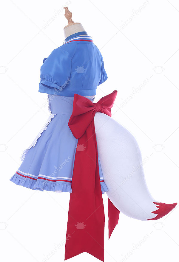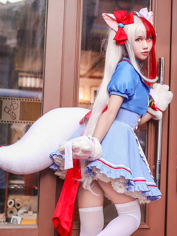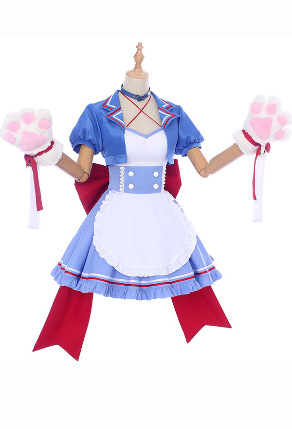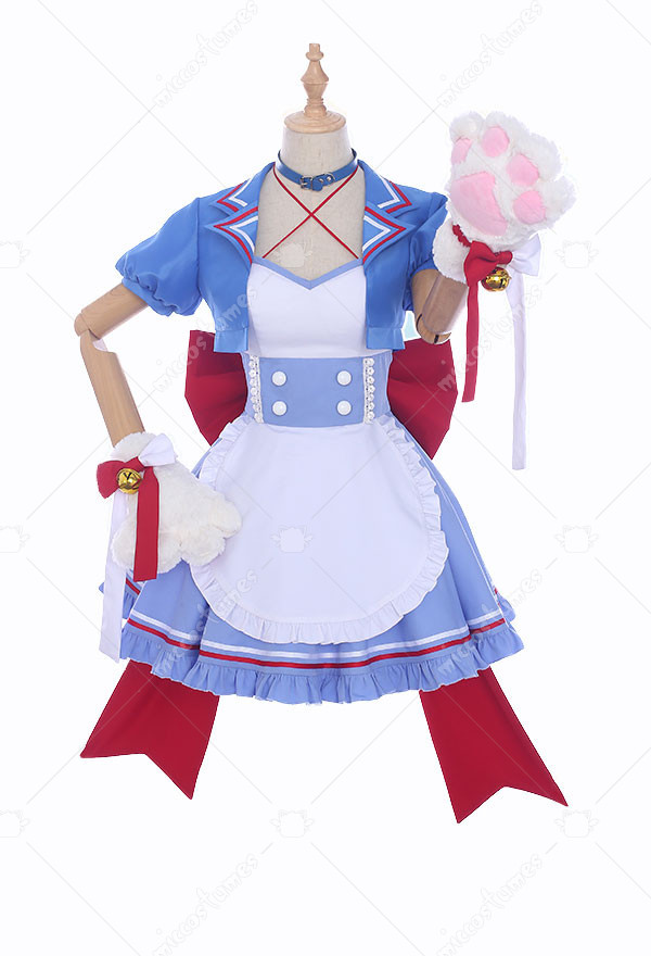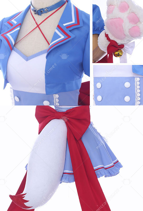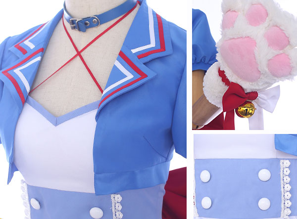 The costume includes dress, coat, head accessory*2, back bow, neck band, back lace, invisible shoulder strap, bell wrist band and tail. Cat claws gloves and wig are sold separately, and they are available in only one size. The gloves are made of high imitation fabric.