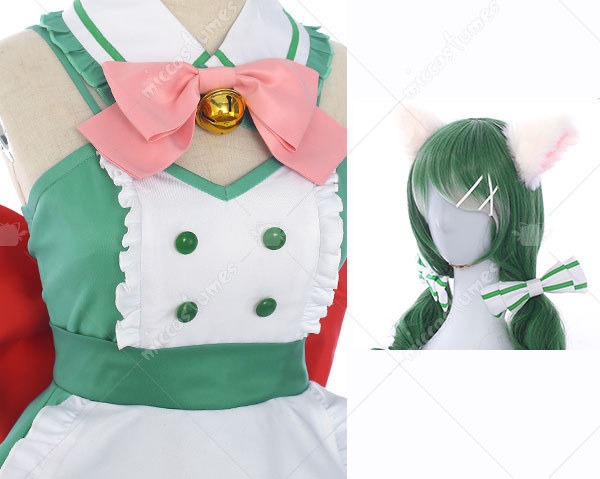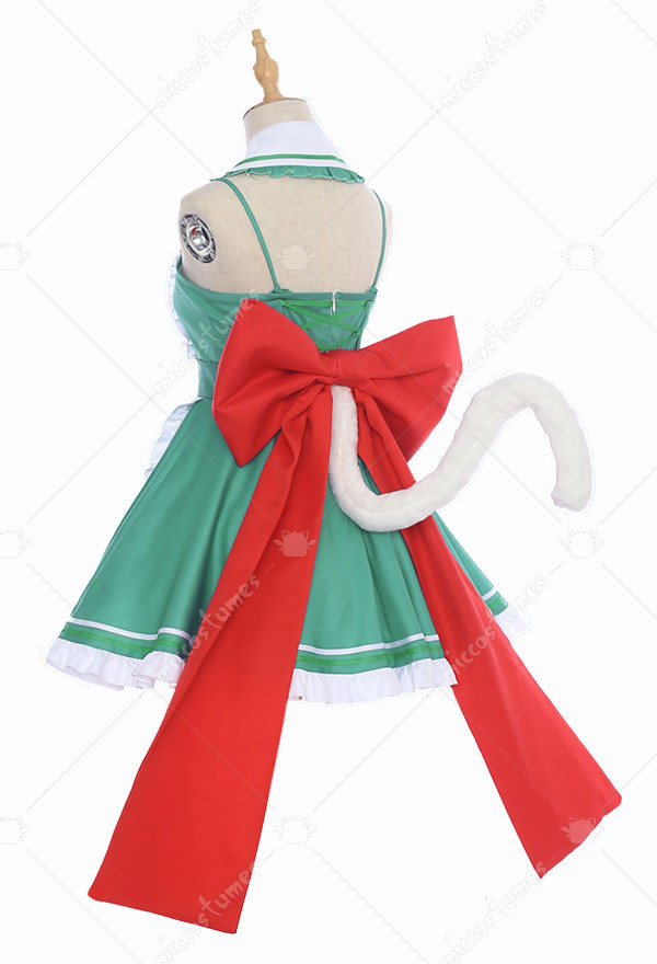 The costume includes dress, fake collar, collar bow, bell wrist band, back bow, back lace, cat ear, cat tail, hair clip*3 and head accessory bow*2. The white cat claws are separately selled. It is made of high imitation fabric.