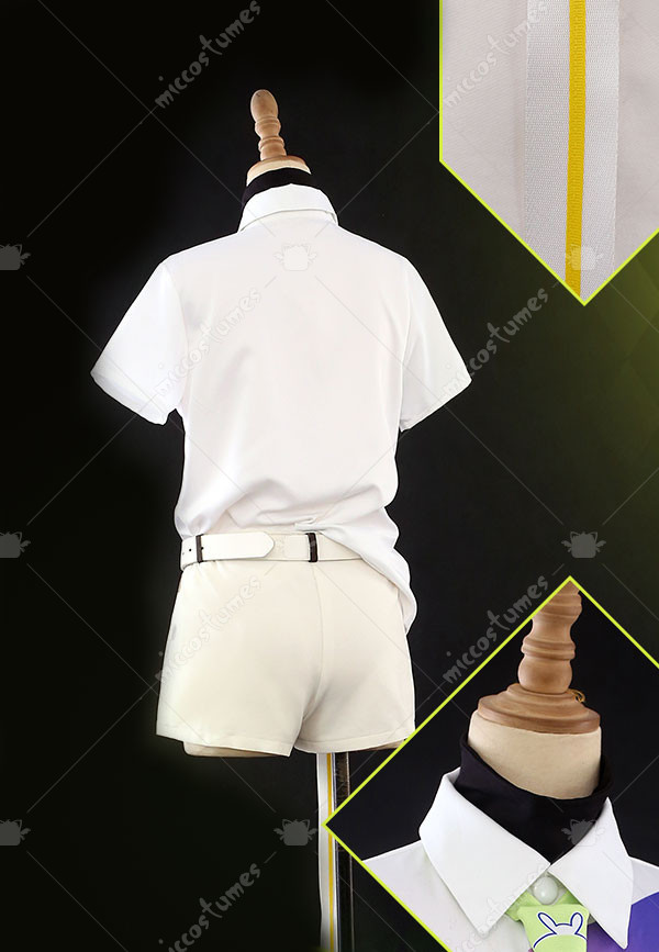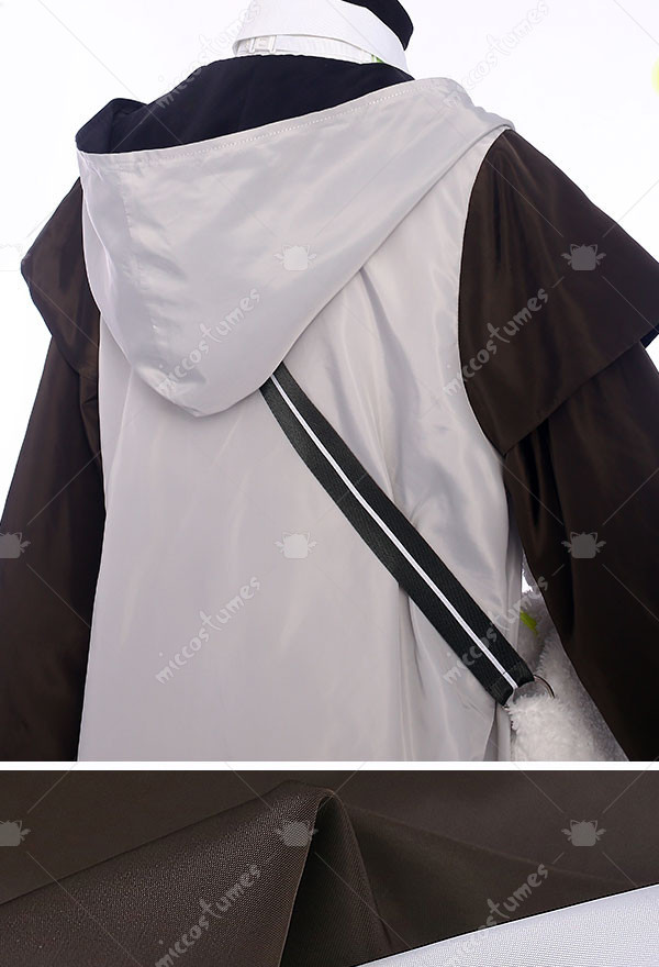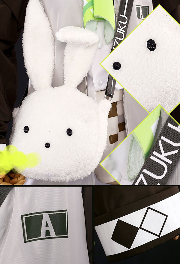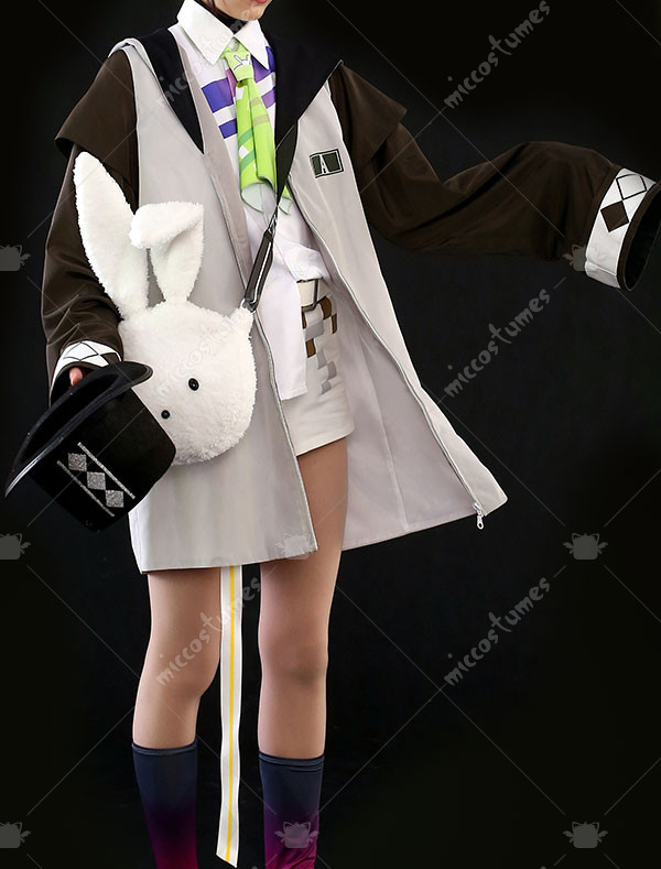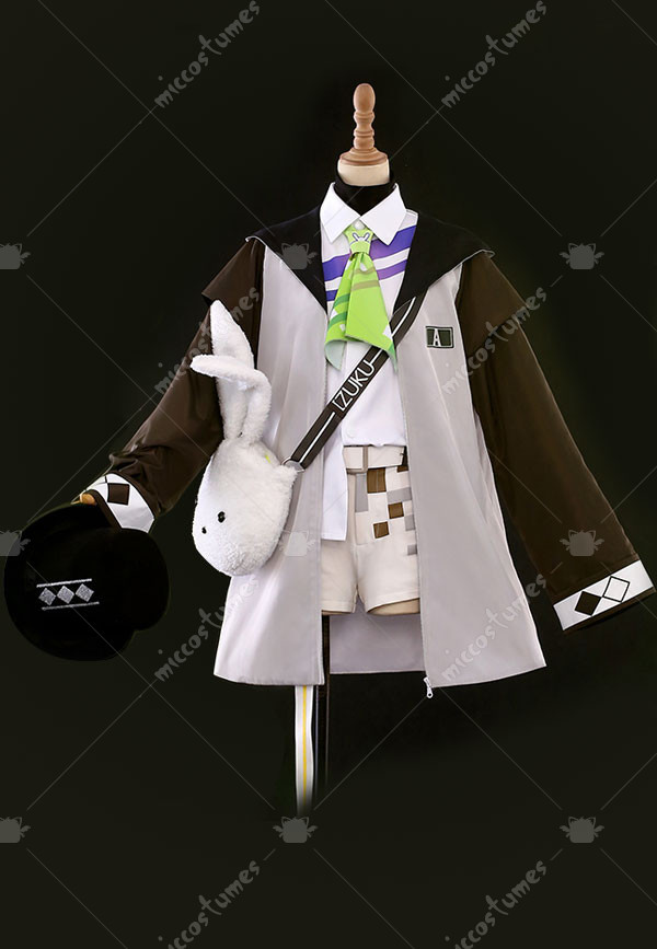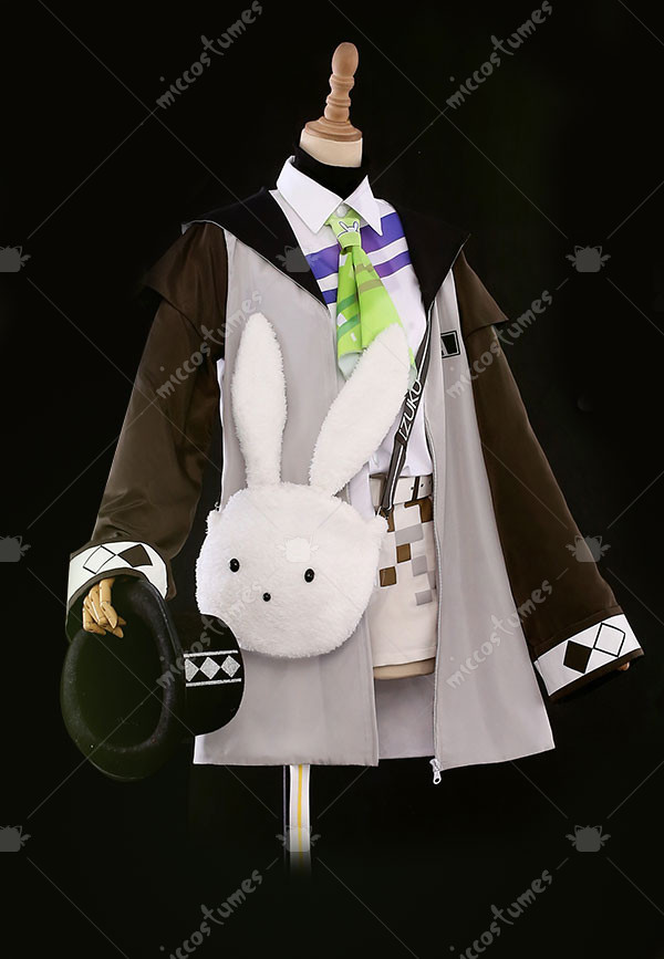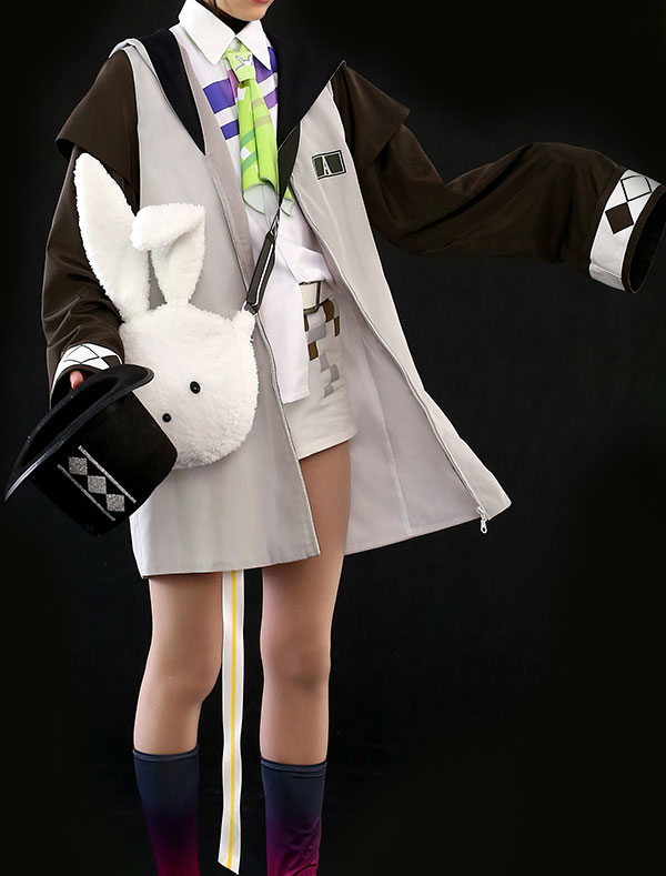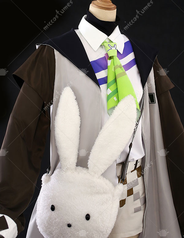 The costume includes shirt, trench coat, tie, shorts, belt, hat, collar, socks, rabbit ear headband and waist chain. The bag is separately selled. It is made of high quality trench coat fabric and denim fabric.