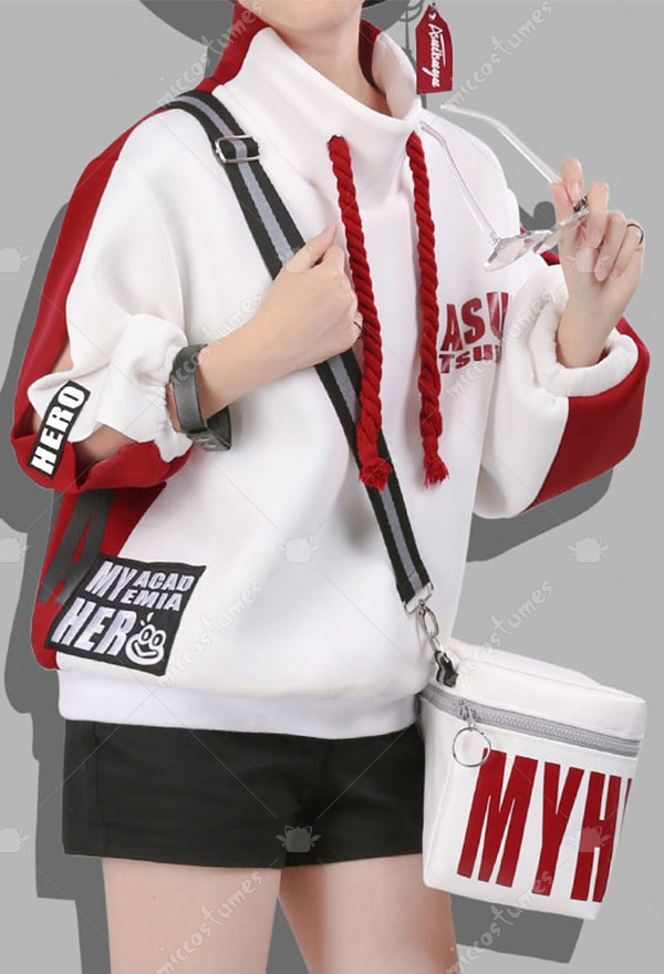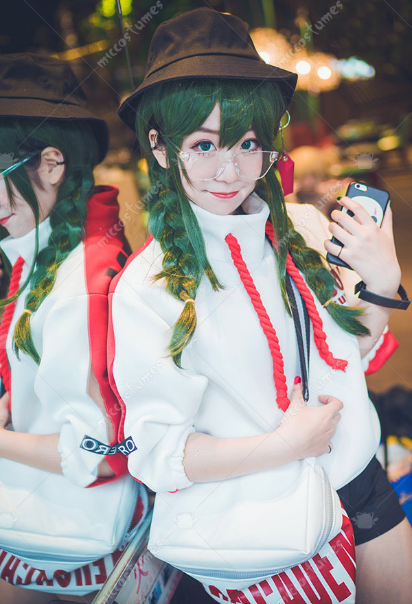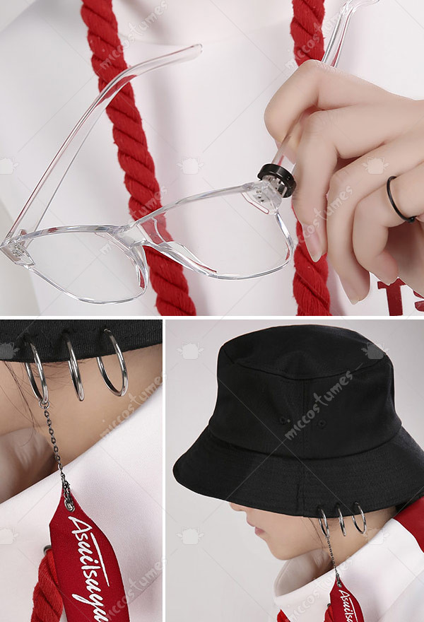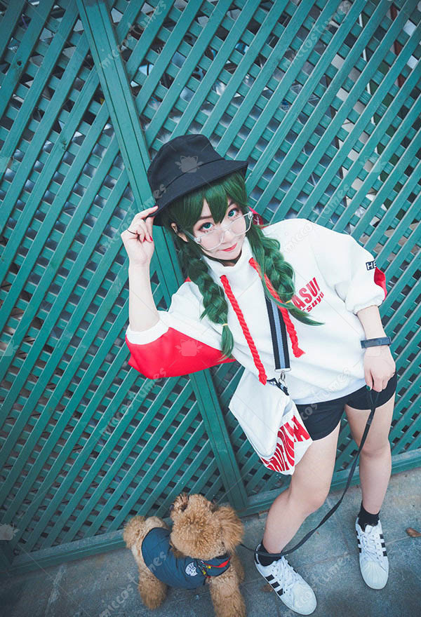 This costume includes hoodie, shorts, fisherman hat, bag, wrist accessory, socks, glasses, ring, earrings. It is made of fleece fabric. Simple and stylish style, soft and skin-friendly fabric, worth buying.