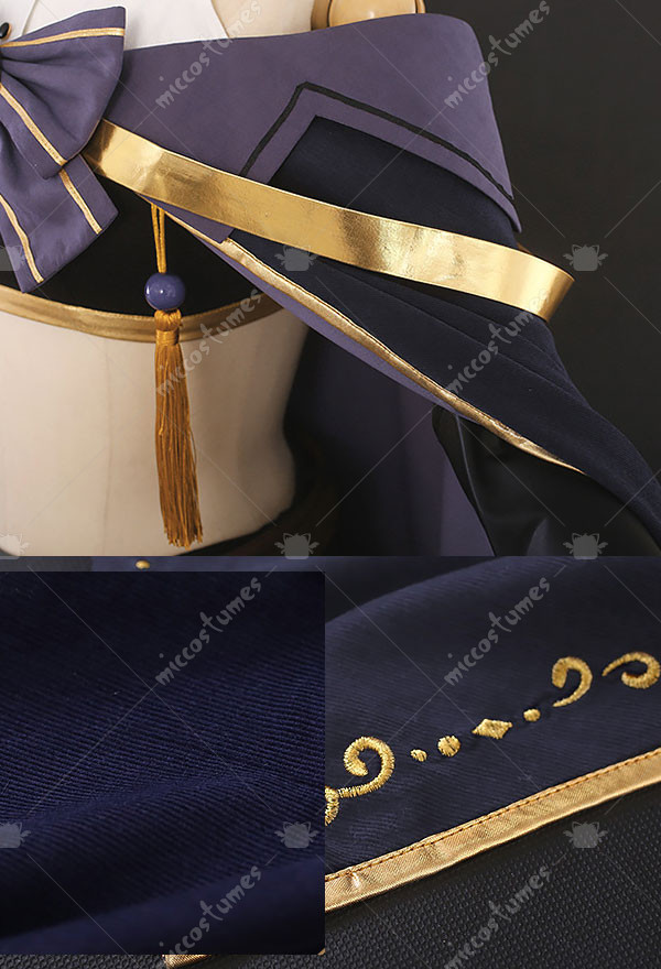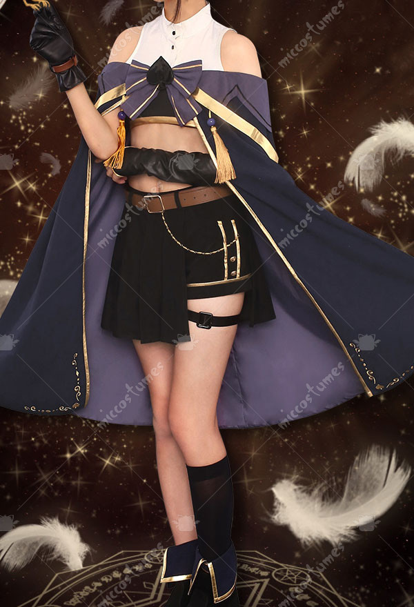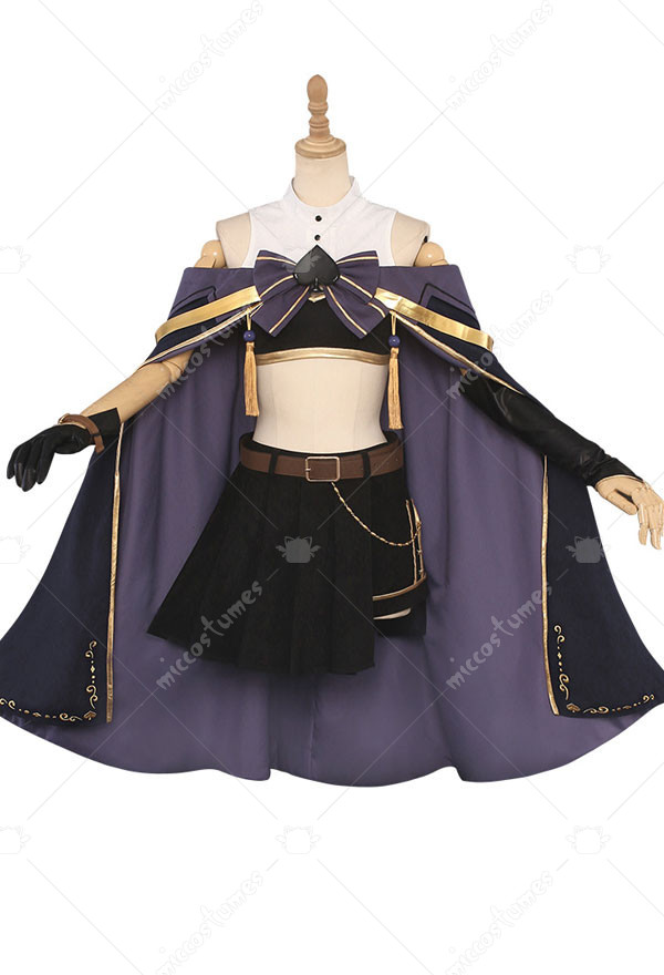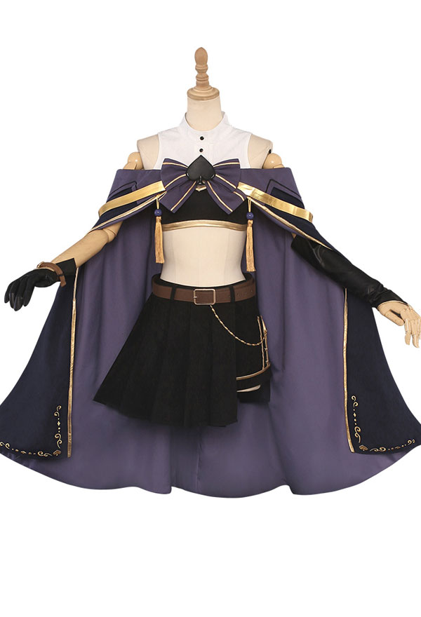 The costume includes top, shorts, leg accessory*2, glove*1, sleeve*1, bowknot, shoulder belt*1, belt*1, tassels, shorts accessory, clips, thigh strap, tube top, socks. It is made of velvet fabric, patent satin.
