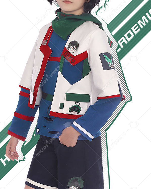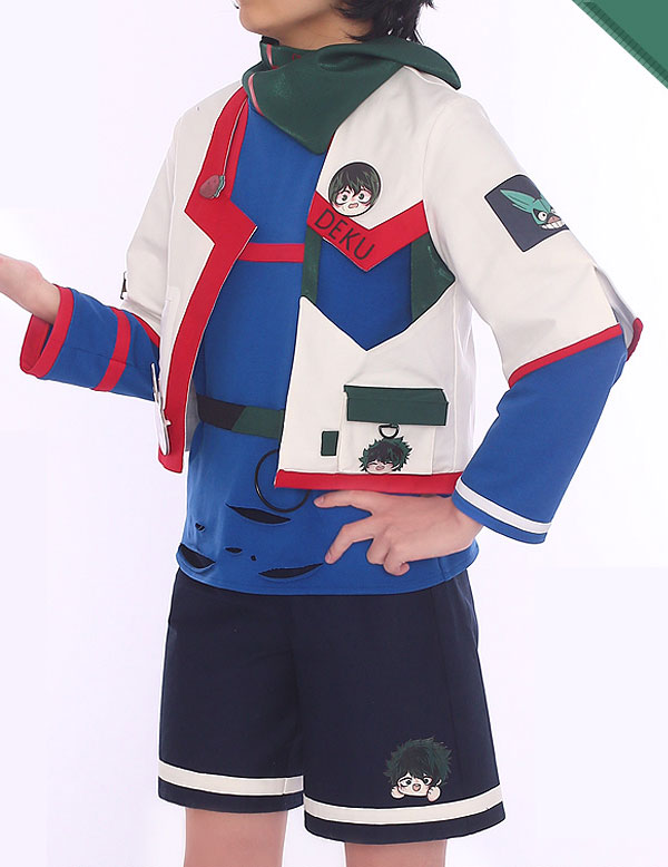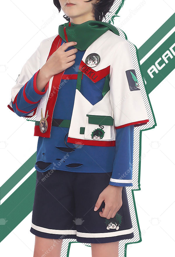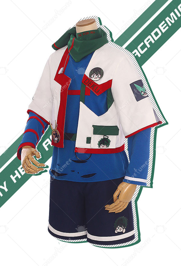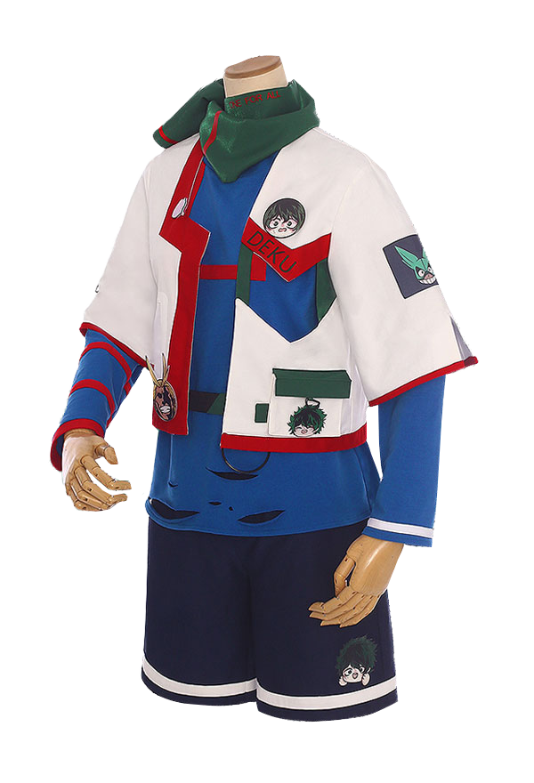 The costume includes scarf, socks, clip, badge, vest, shorts, belt, shirt.