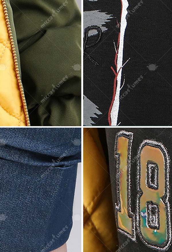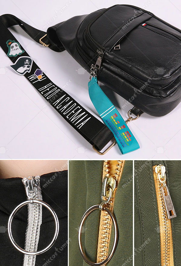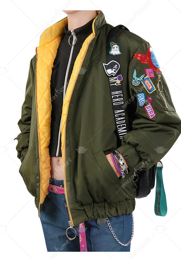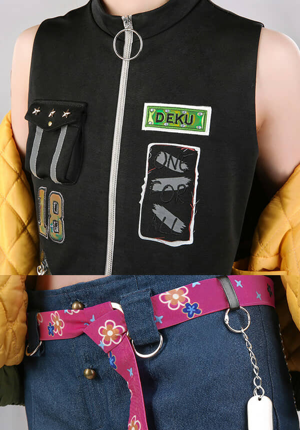 This costume includes jacket, sleeveless top, pants, belt, backpack, tattoo stickers, bracelets, backpack pendants. It is made of waterproof cotton material, denim fabric. Slim tailoring design, simple and chic.