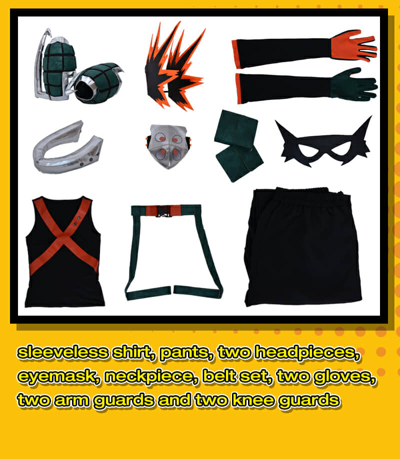 | Included Items | Sleeveless shirt, pants, two headpieces, eyemask, neckpiece, belt set, two gloves, two arm guards and two knee guards |