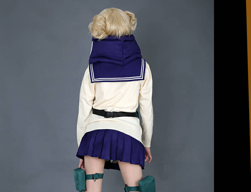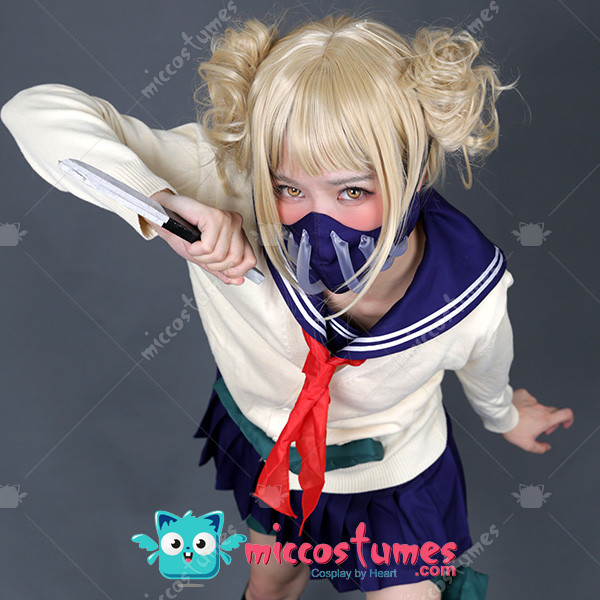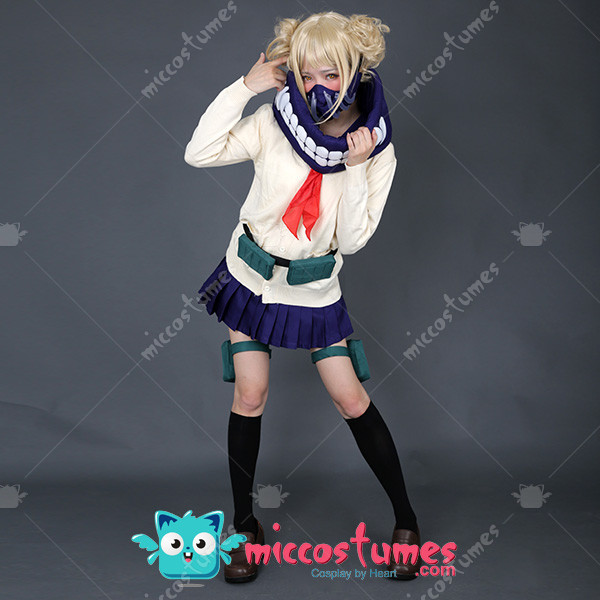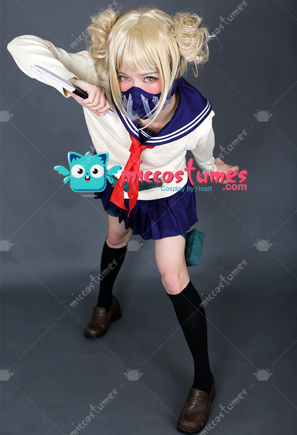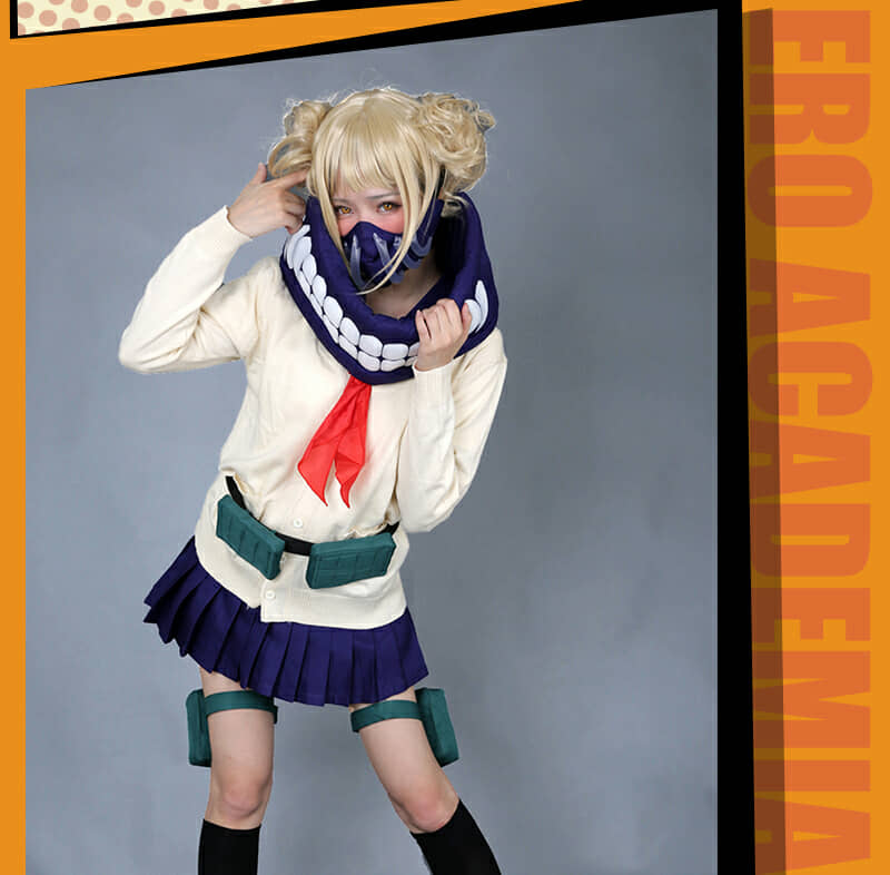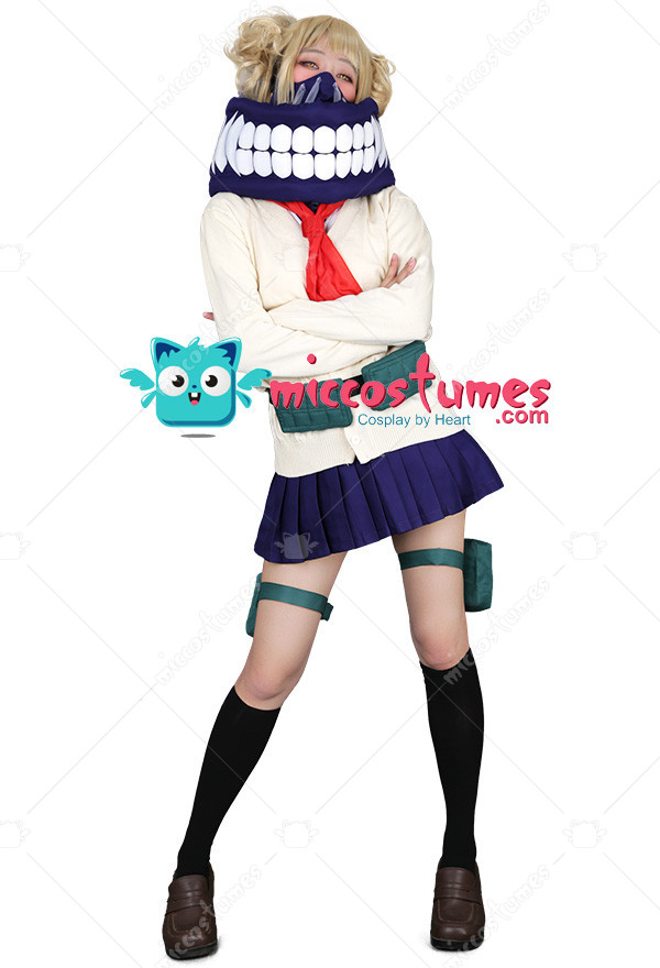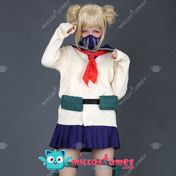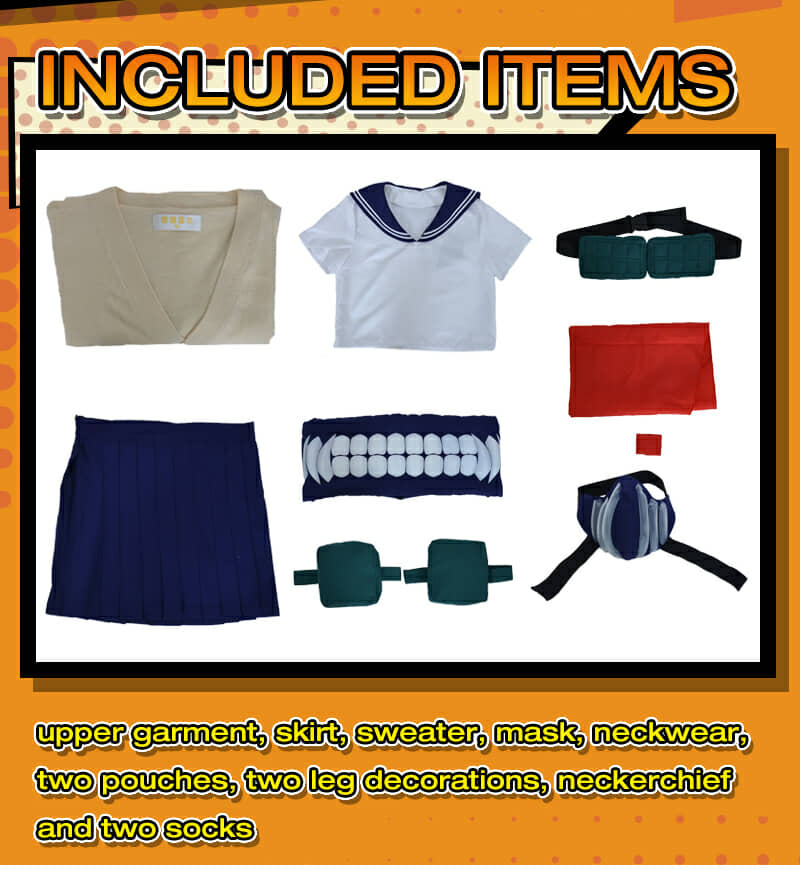 Includes: upper garment, skirt, sweater, mask, neckwear, two pouches, two leg decorations, neckerchief and two socks Material: Uniform cloth Nice Details: The Himiko Toga cosplay scarf features teeth prints, and mask covers half of the face. The Himiko Toga cardigan is in beige color and good for daily wear. The sailor suit uniform is a short sleeve shirt with sailor collar and a pleated navy blue skirt.
