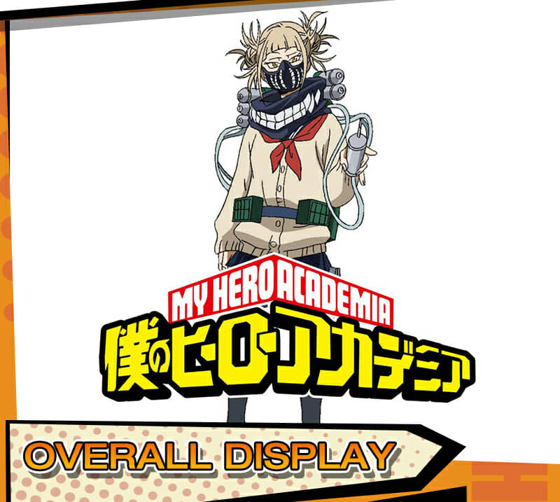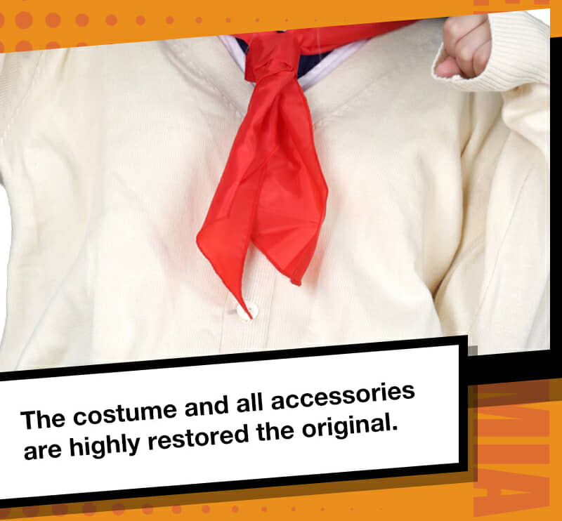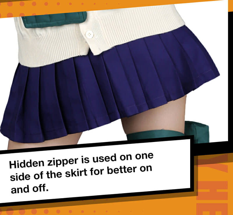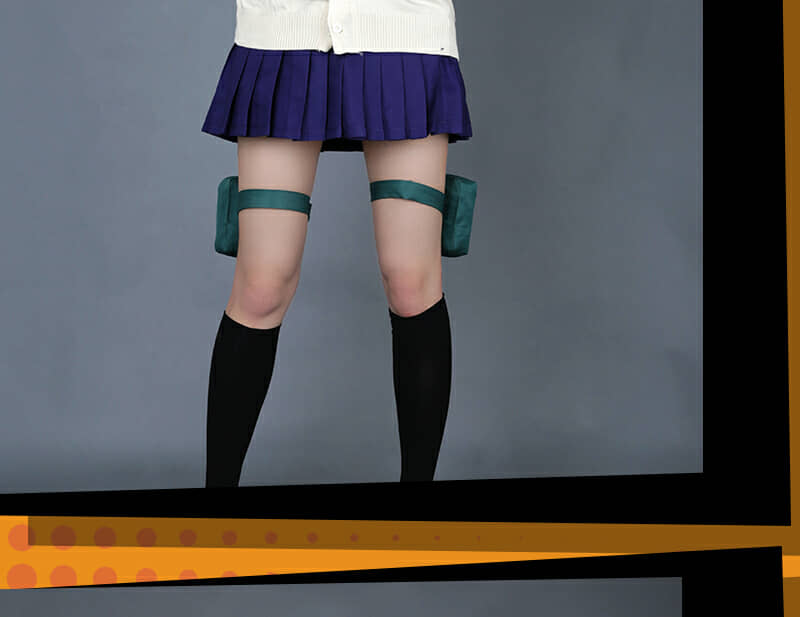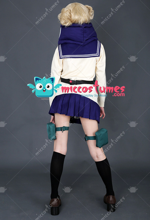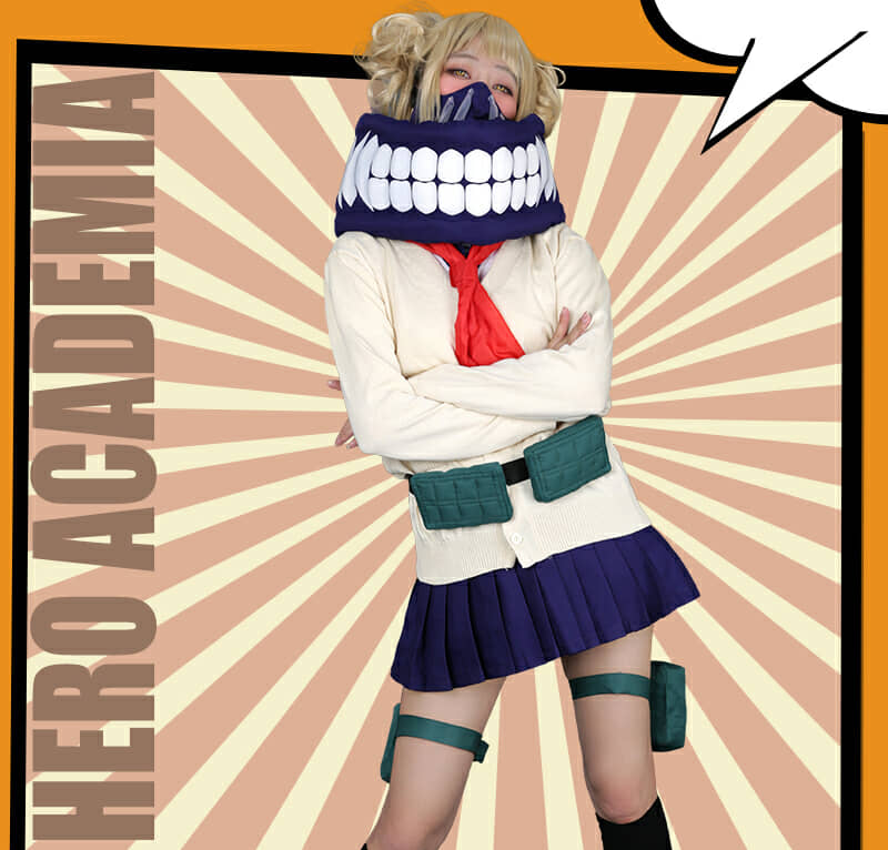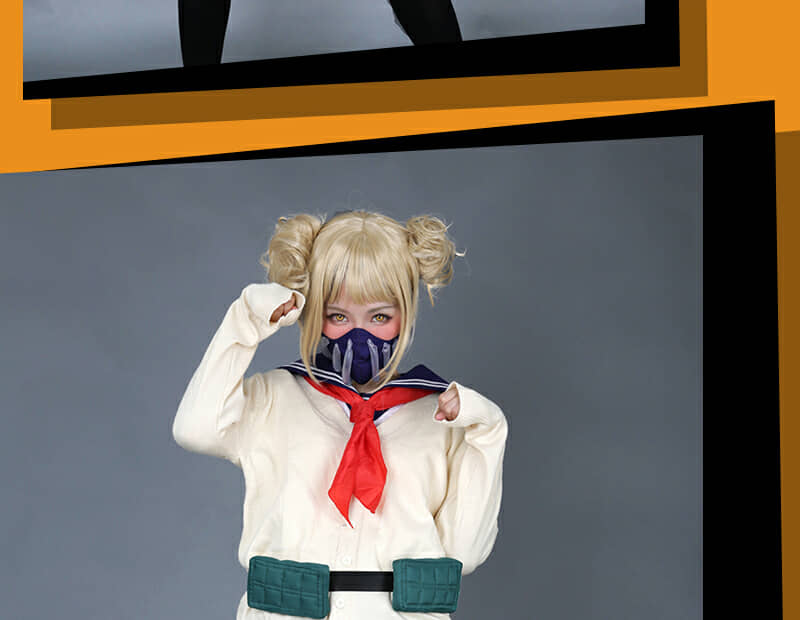 Includes: upper garment, skirt, sweater, mask, neckwear, two pouches, two leg decorations, neckerchief and two socks Material: Uniform cloth Nice Details: The Himiko Toga cosplay scarf features teeth prints, and mask covers half of the face. The Himiko Toga cardigan is in beige color and good for daily wear. The sailor suit uniform is a short sleeve shirt with sailor collar and a pleated navy blue skirt.
