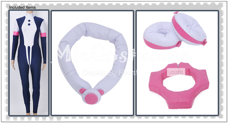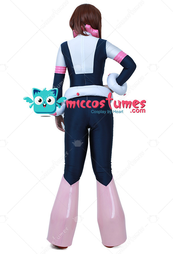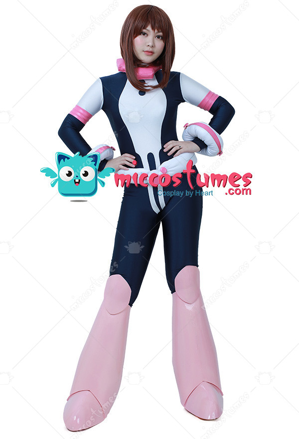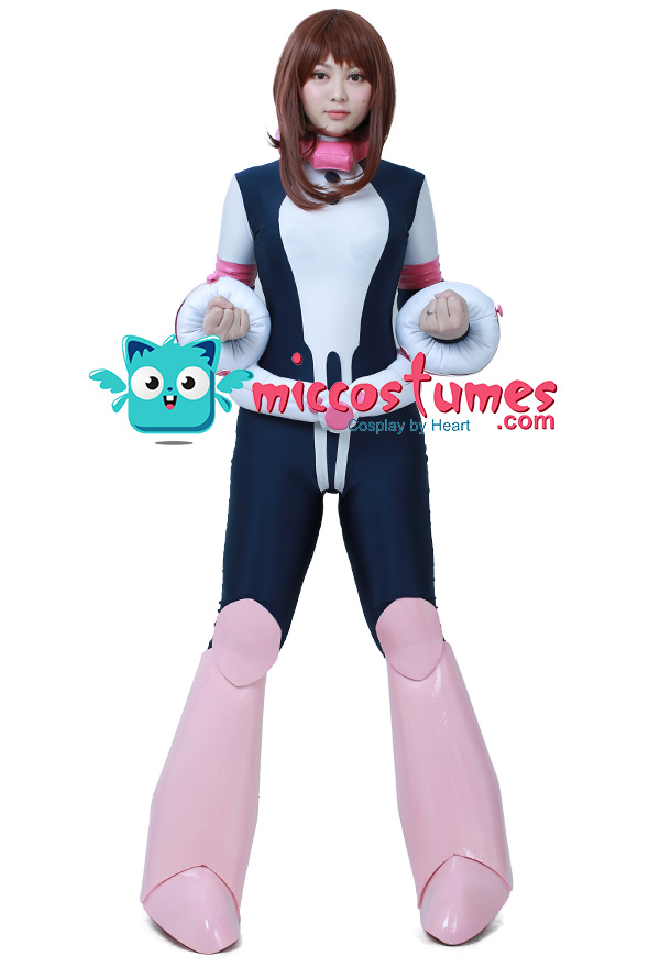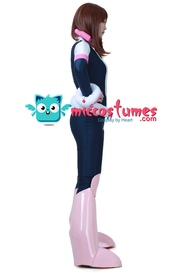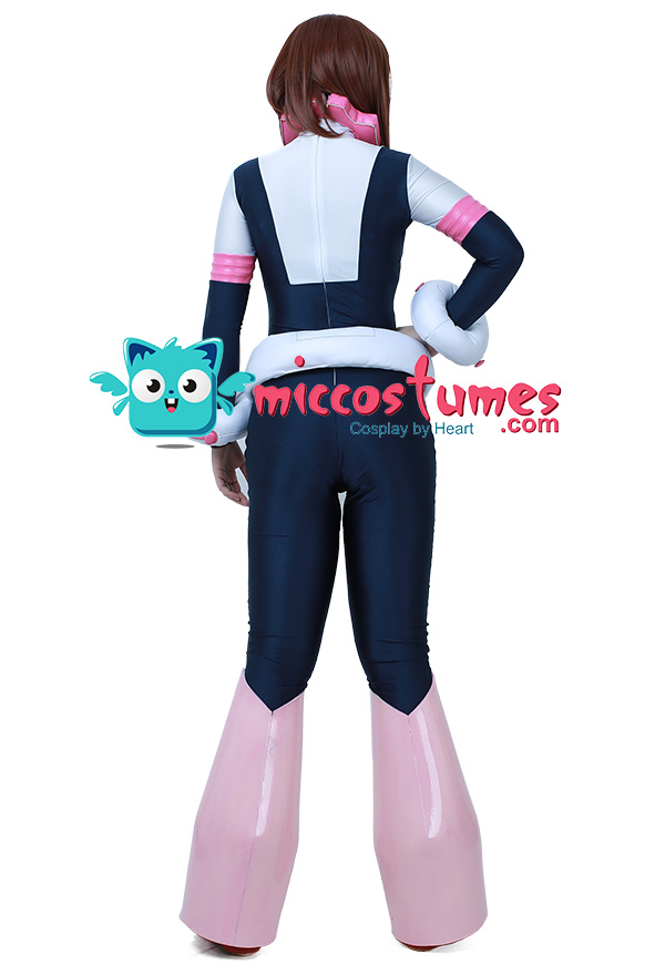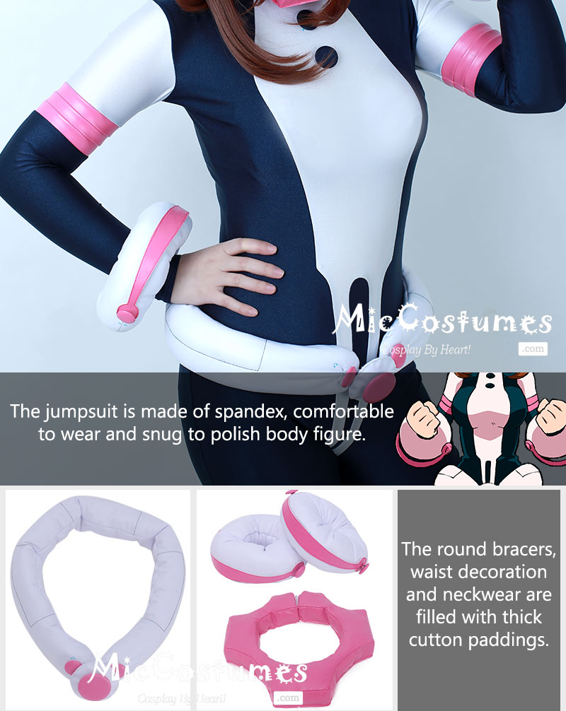Includes: Bodysuit, bracelet ornaments×2, waist decoration, neckwear(shoes are not included). Material: Spandex, PU leather. Nice Details: The Uraraka jumpsuit is made of breathable and stretchy fabric for comfortable fit. This Uraraka Ochako cosplay suit zips up at back allowing for easy wear.