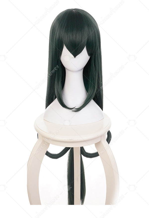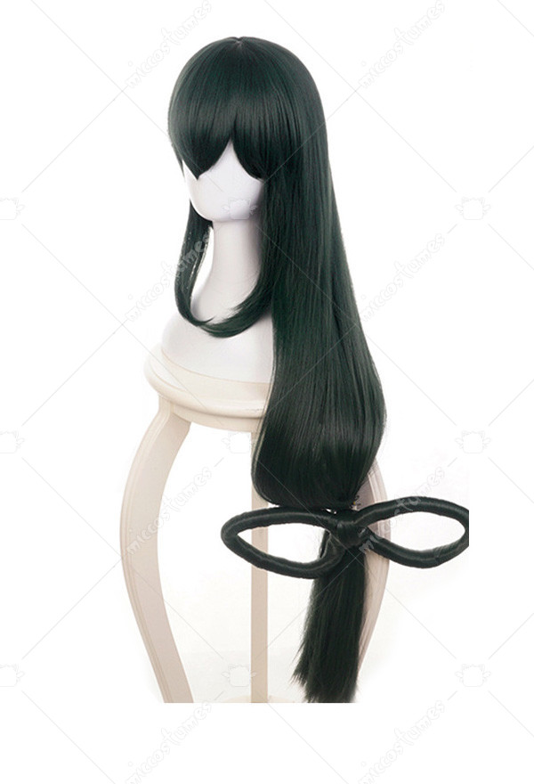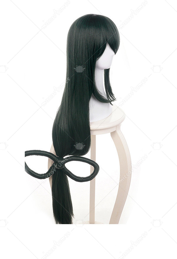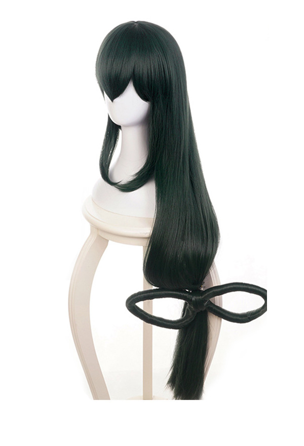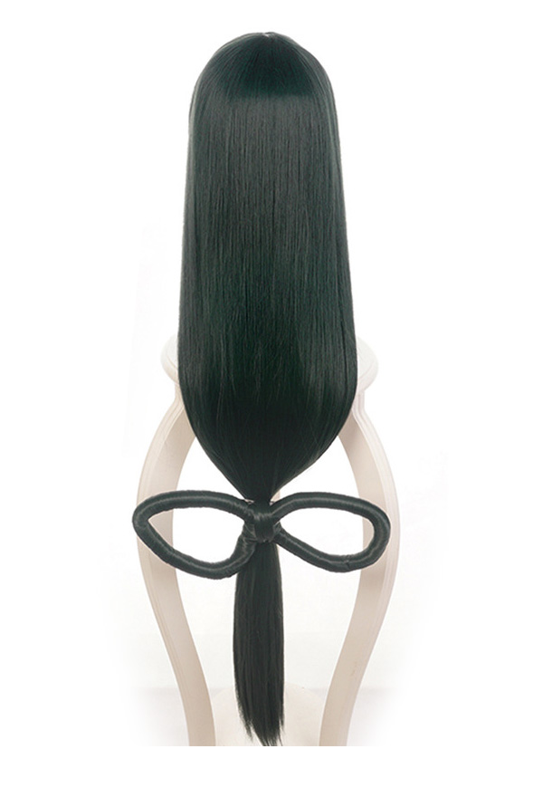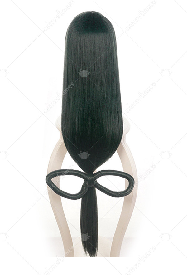 This beautiful dark green straight wig is about 110cm long. You can fix the hair by adding a ponytail around the hair tail.