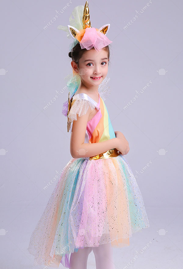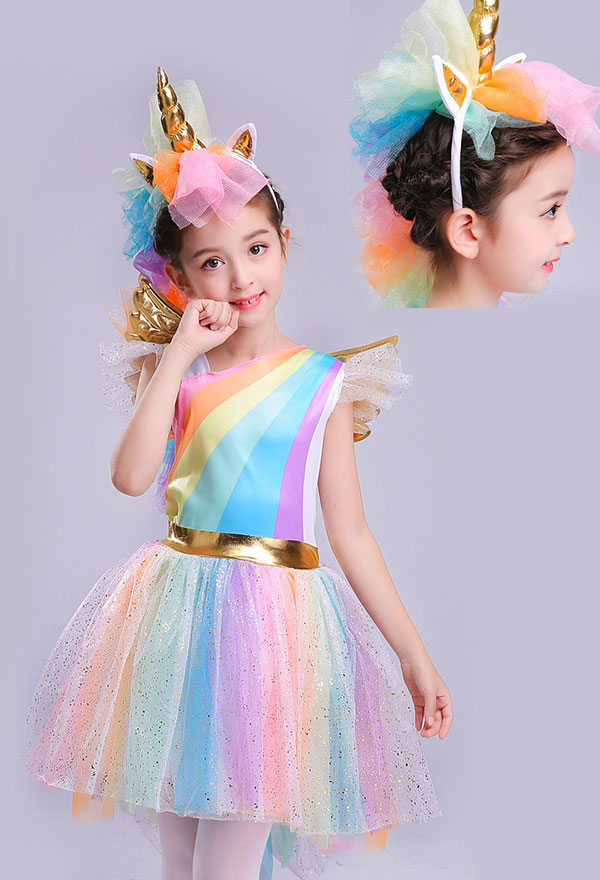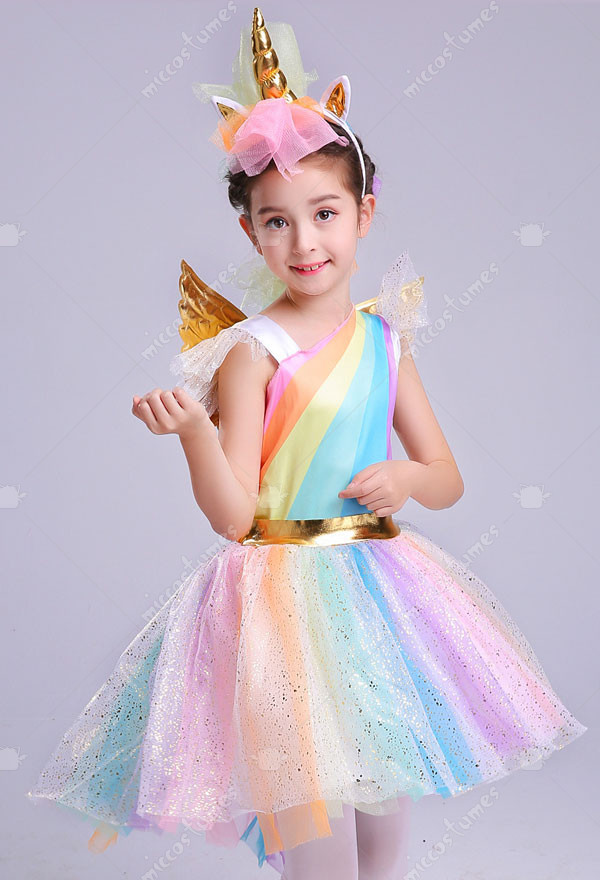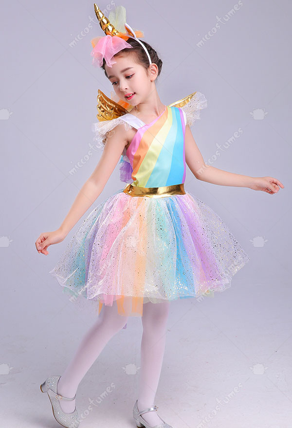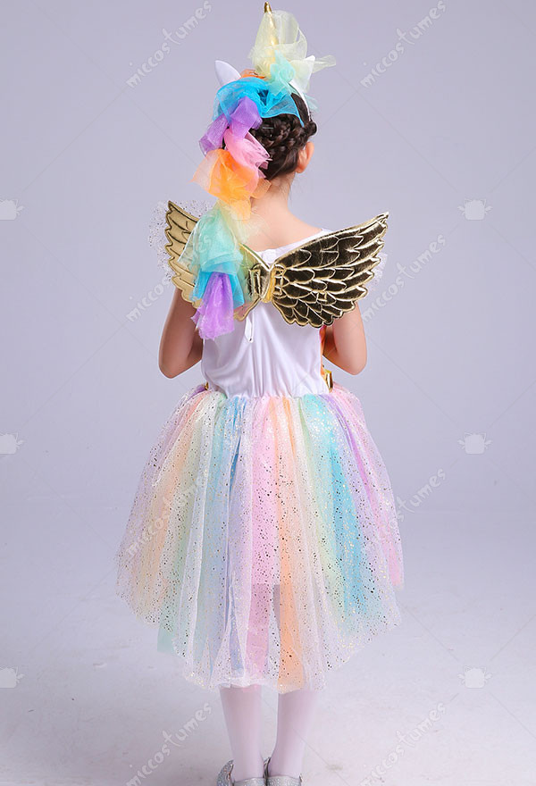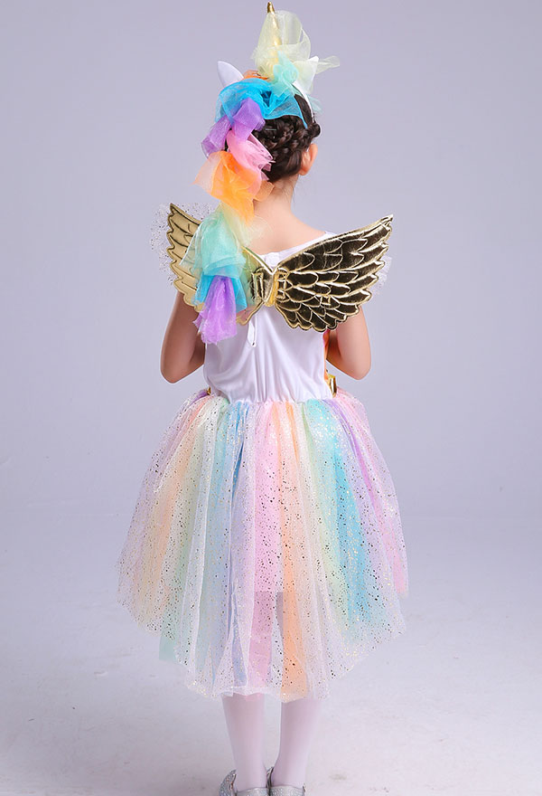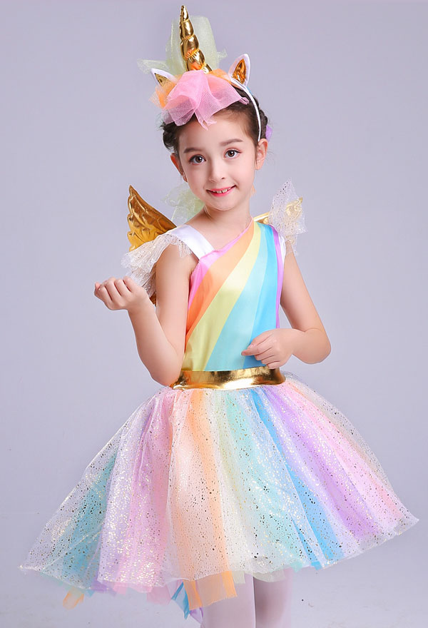 The costume includes dress, hair accessory, wings. It is made of polyester.