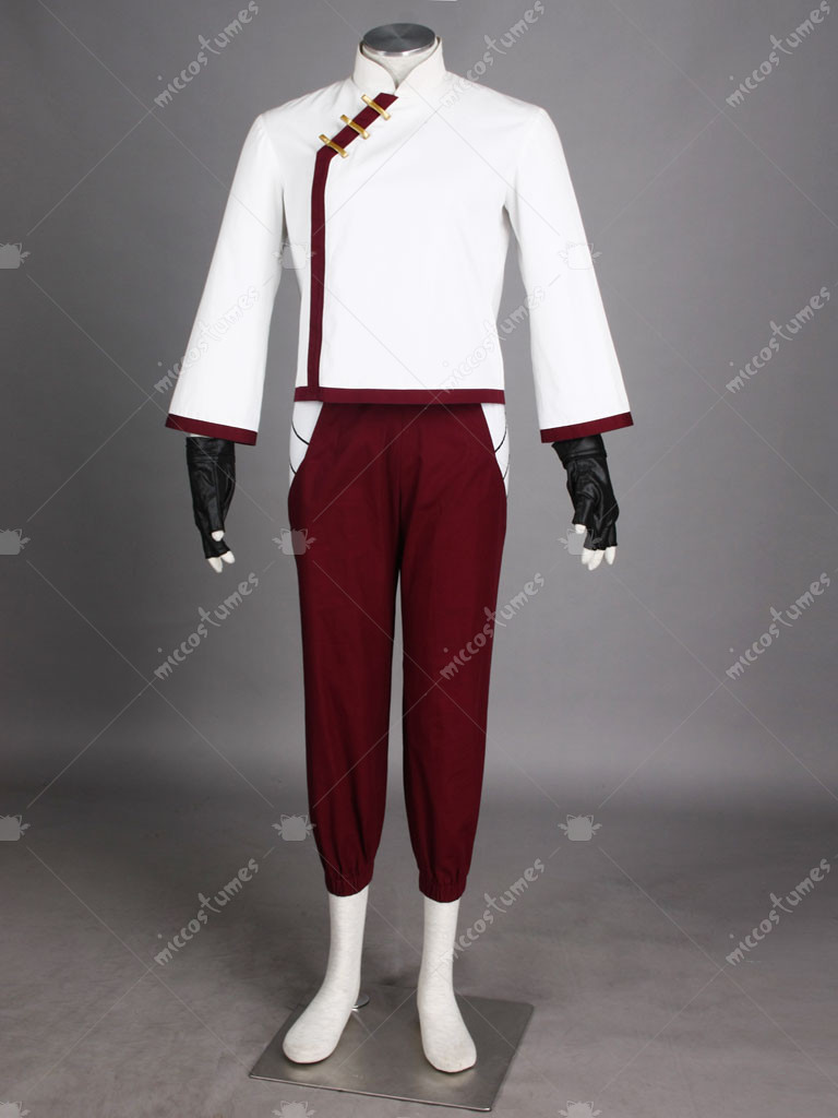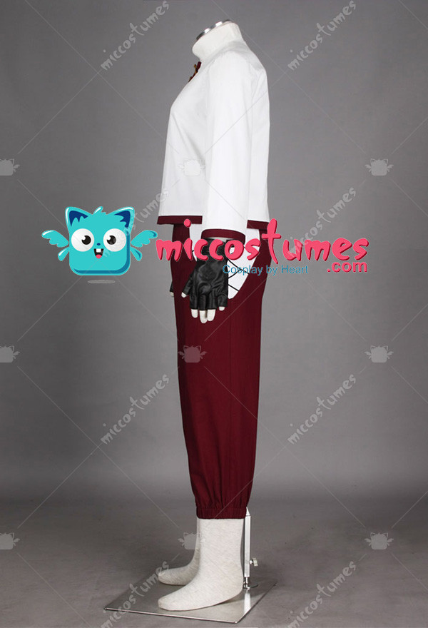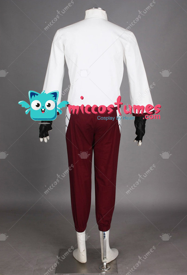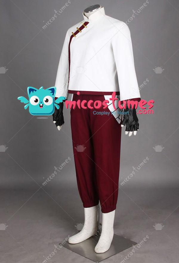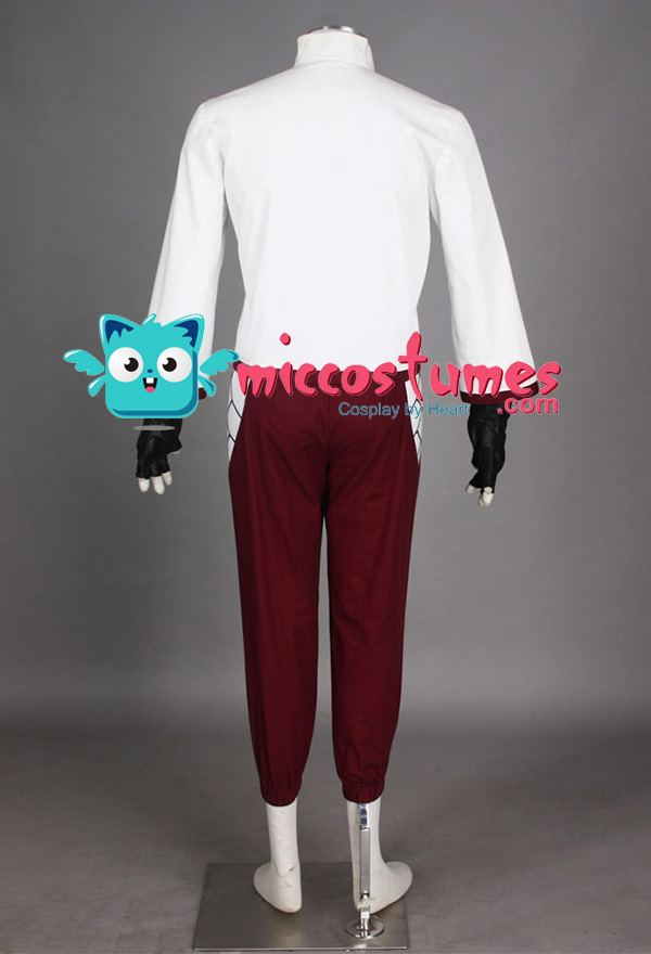 1.Jacket: This white jacket is made from high-end uniform cloth which will guarantee you complete comfort and durability. Three orange Chinese knot buttons are delicately and firmly sewn under the collar. The 58 cm long zipper (L) covered by white cloth is sewn on the back of the jacket from the collar to the bottom. A dark red cloth is embroidered on the front of this jacket and the bottom as decoration.