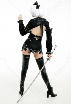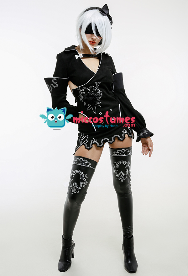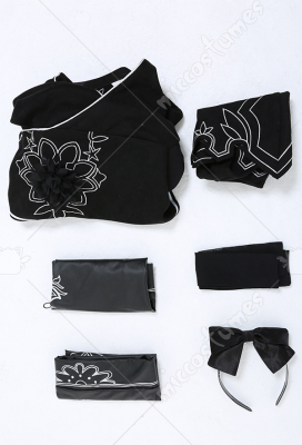 Costume Includes: top, short pants-like skirt, stockings*2, blindfold, headband. Material: chiffon, matte black leather, suede, satin. Design Details: The outfit is made of suede, which can be very elastic. The top and the pants-like skirt both adopt embroidery craftswork. And, screen printing decorated sleeves and stockings. Besides, the blindfold and the headband are both in this outfit.