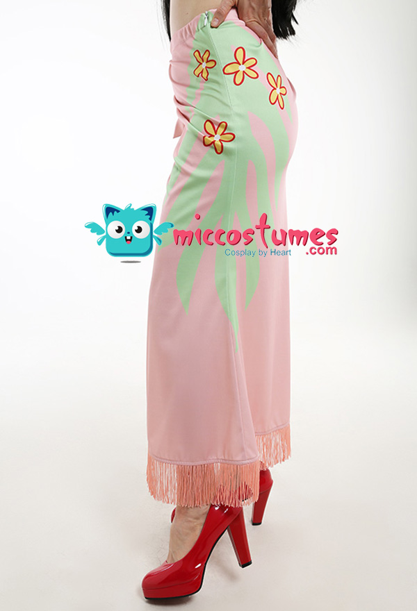 Costume Includes: top, dress. Material: coated fabric. Design Details: The top adopts printed coated fabric, and is with a zipper on the front middle part. The wrap skirt is digitally printed, and the hem is decorated with tassel ruffles.