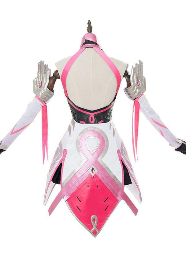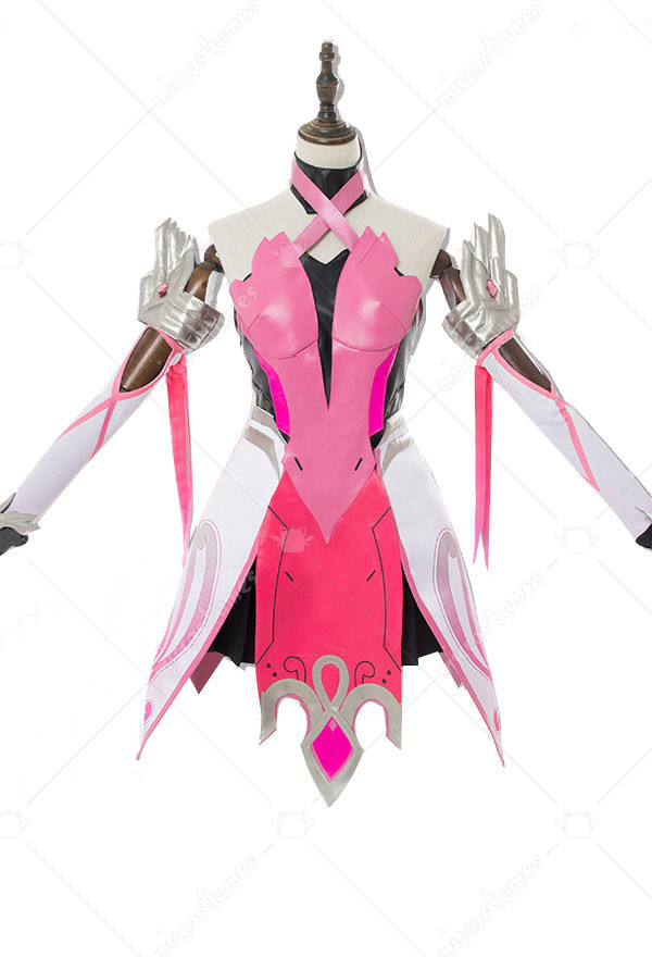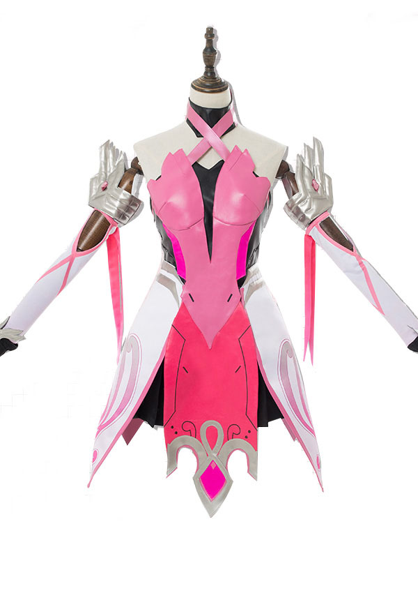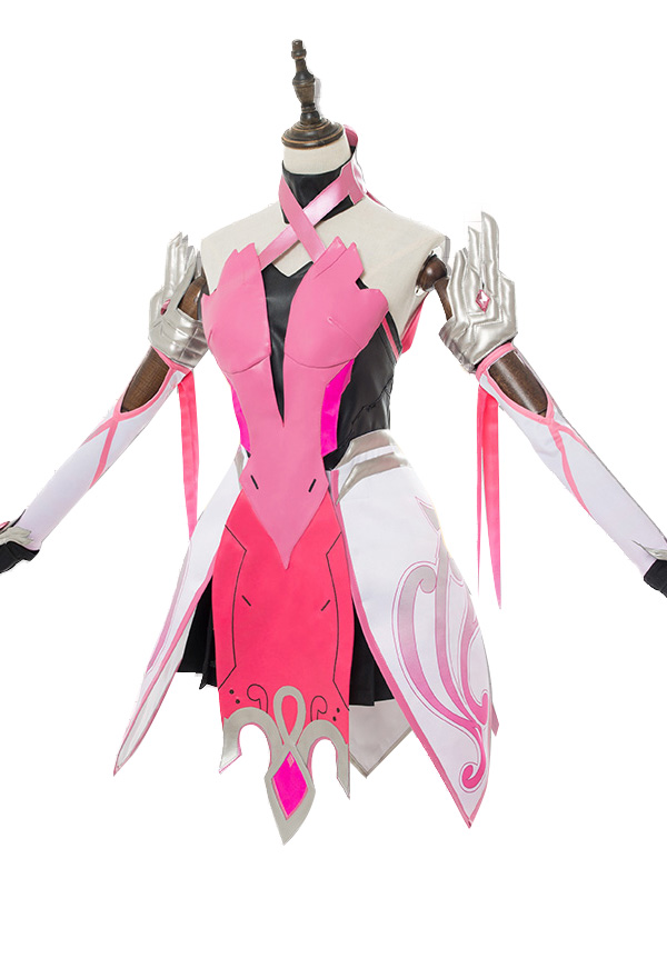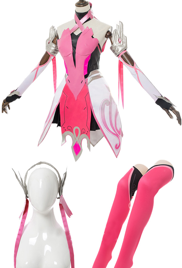 It's mainly made of leather and wedding satin. The full set includes the dress, the arm set, headdress and stockings.