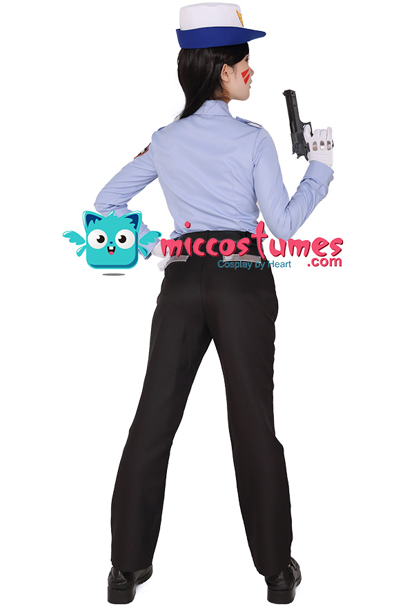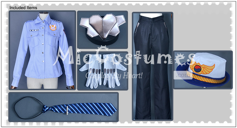 This costume includes blouse, trousers, hat, glovesX2, belt, tie. It is made of uniform cloth, PU leather.