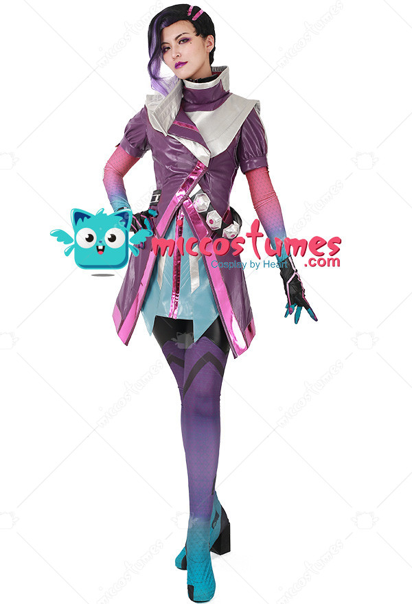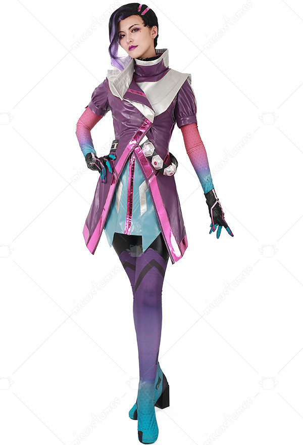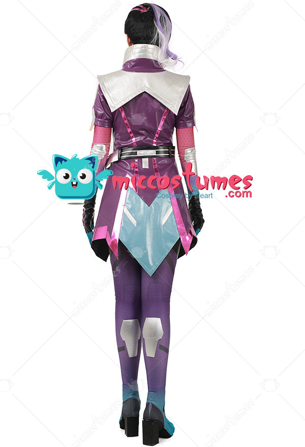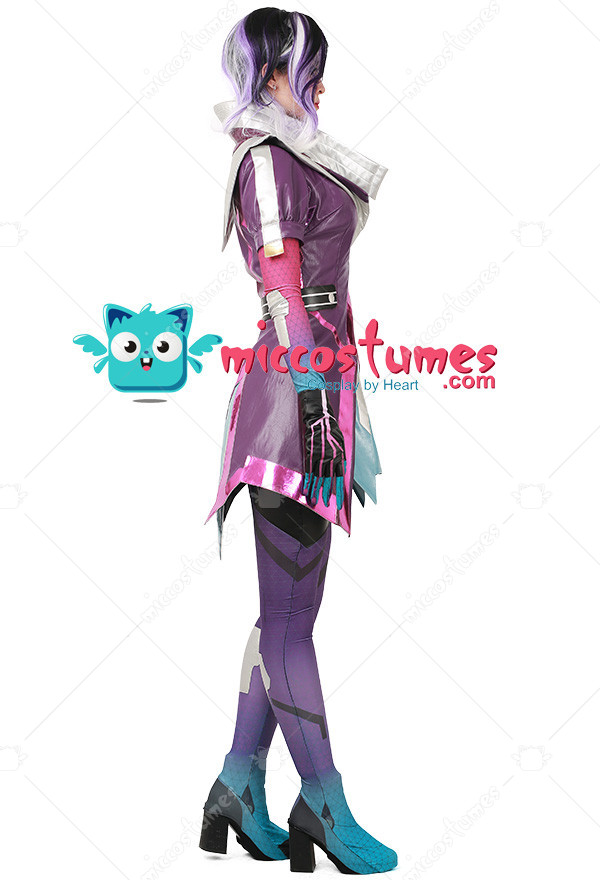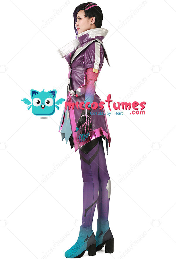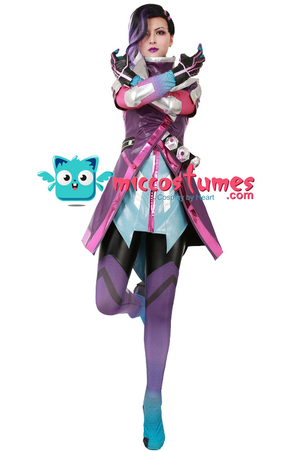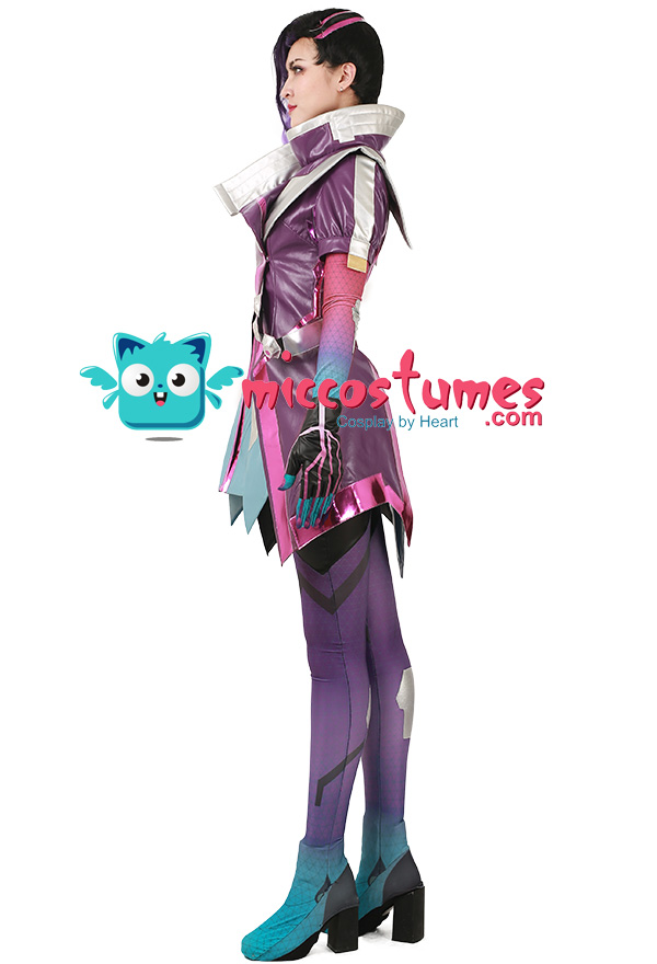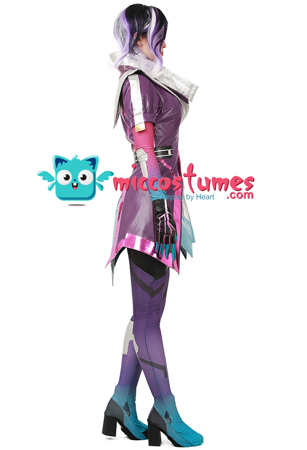 The costume includes coat, top with gloves, half-finger gloves, leggings, waistband. It is made of PU leather, print fabric, spandex fabric, elastic leather.