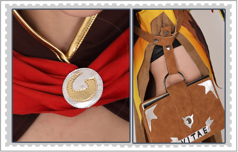 This costume includes dress, shorts, hat, gloves×2, shoe covers×2, belt, book cover, wings, shoulder cape. It is made of uniform cloth, spandex, PU leather, chamois.