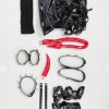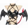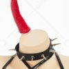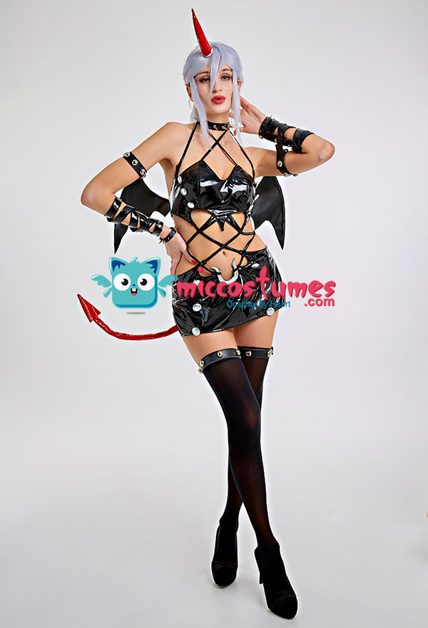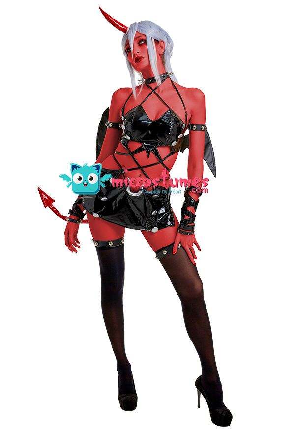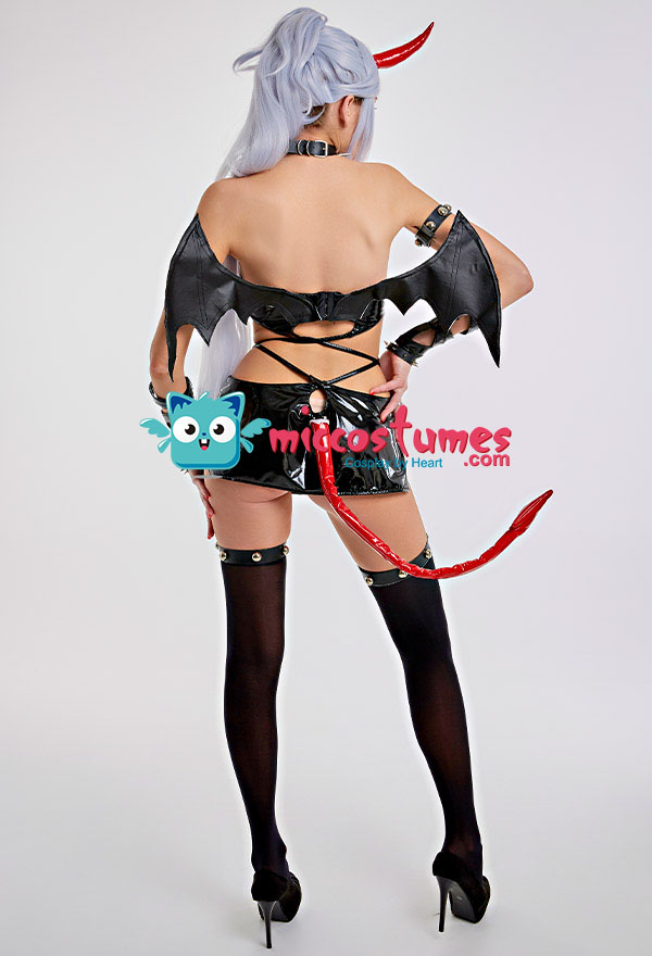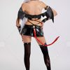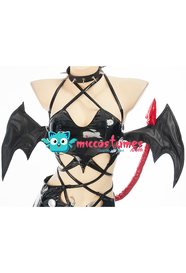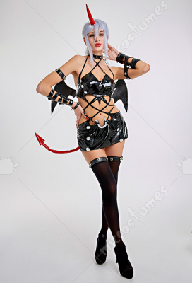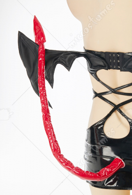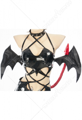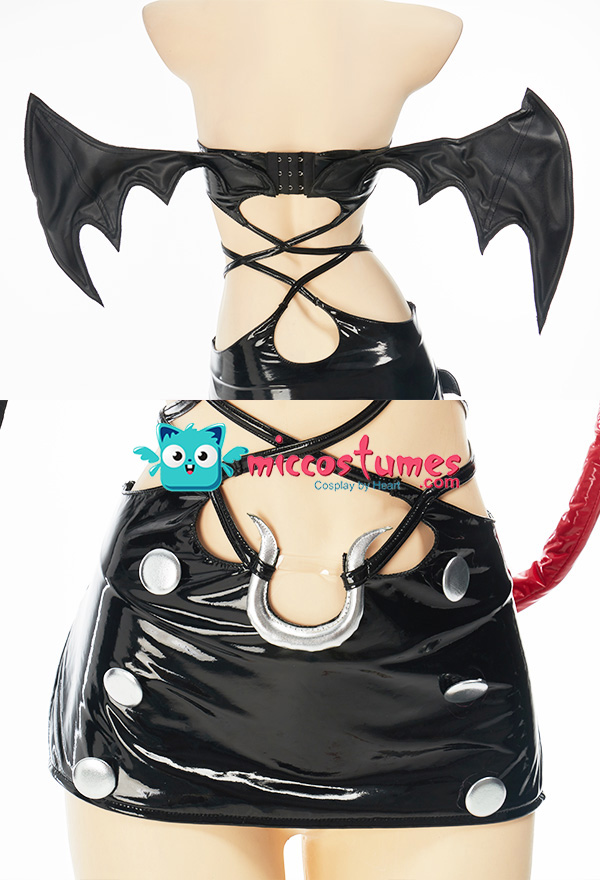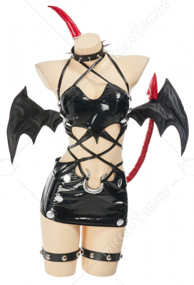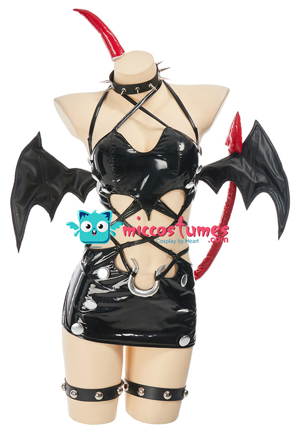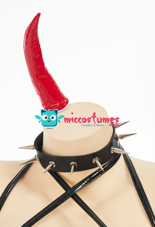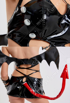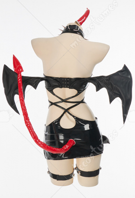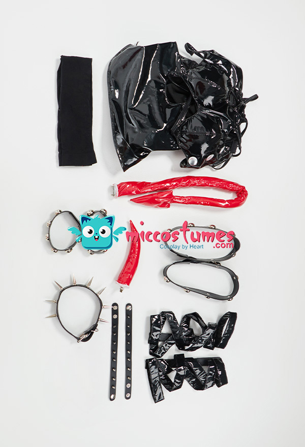 Design details: This lingerie set is made of elastic enamelled leather and is accessorized with mushroom bumps. The waist and arms are designed with lace-ups. The back of the jacket is breasted to make it easy to wear. The side of the skirt is sewn with a zipper. The headdress and tail are made of enamelled leather.