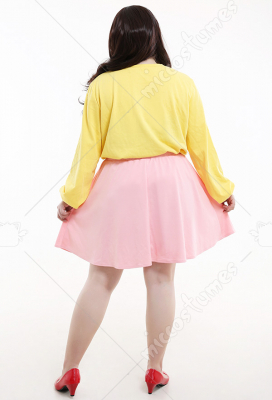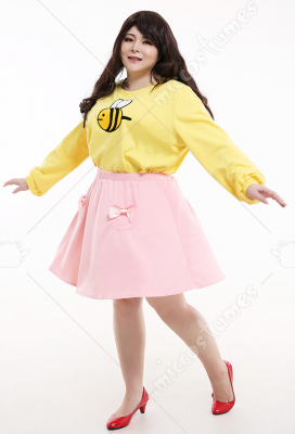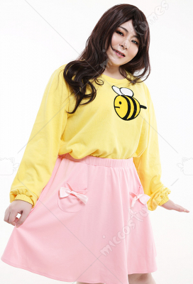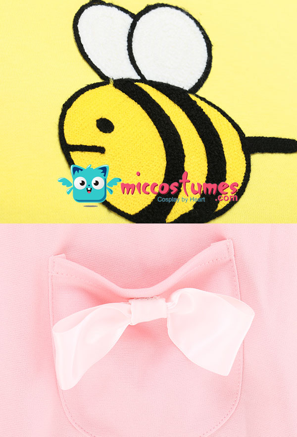 Costume Includes: hoodie, skirt. Materials: twisted Roman fabric, hoodie fabric. Design Details: The hoodie is designed as loosen form, with soft and smooth hoodie fabric on, can be worn in a comfortable way. The chest part is decorated with a bee pattern embroidered sticker. The skirt is designed as adjustable form on the waist, and its pink color looks lively.