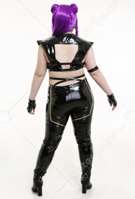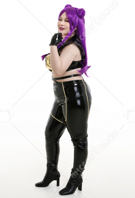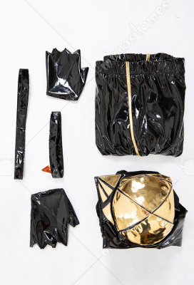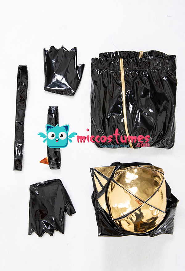 Costume Includes: Top, Pants, Gloves*2, Neck Accessory, Wristband. Material: PU leather.