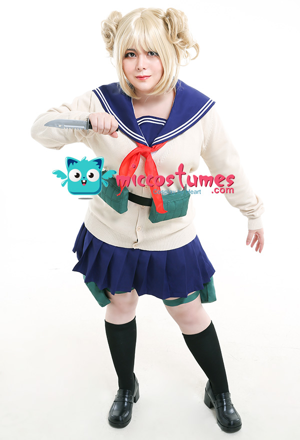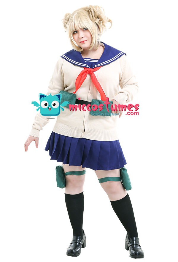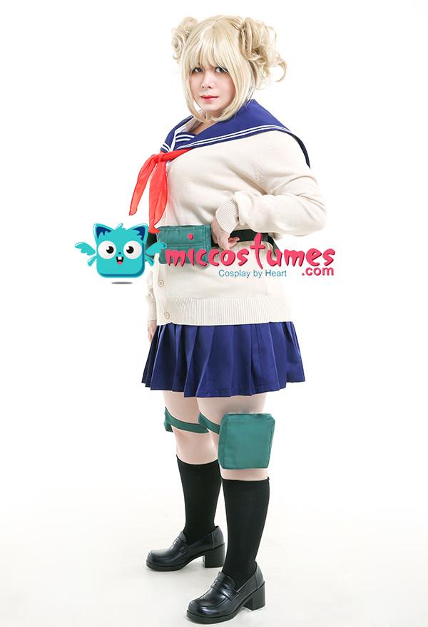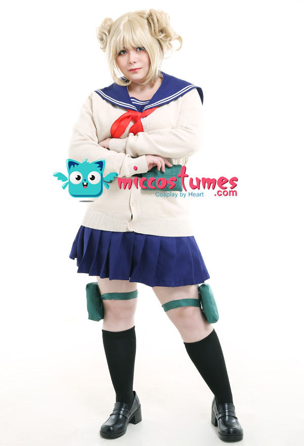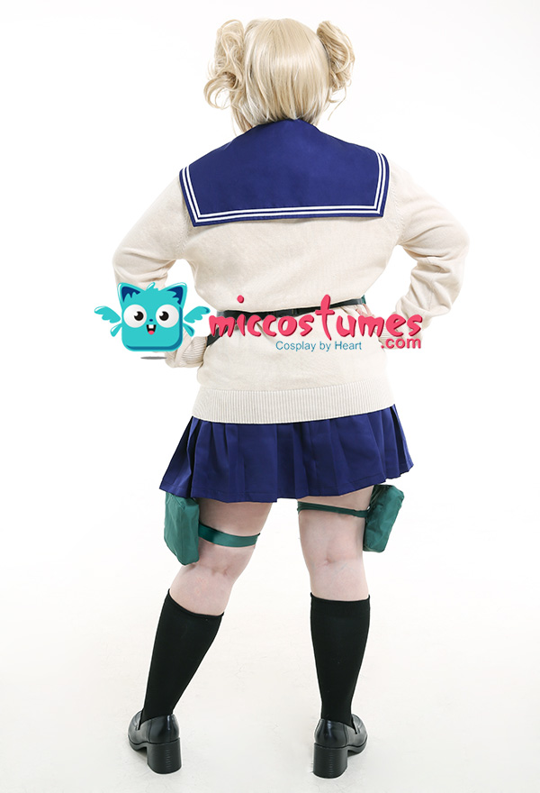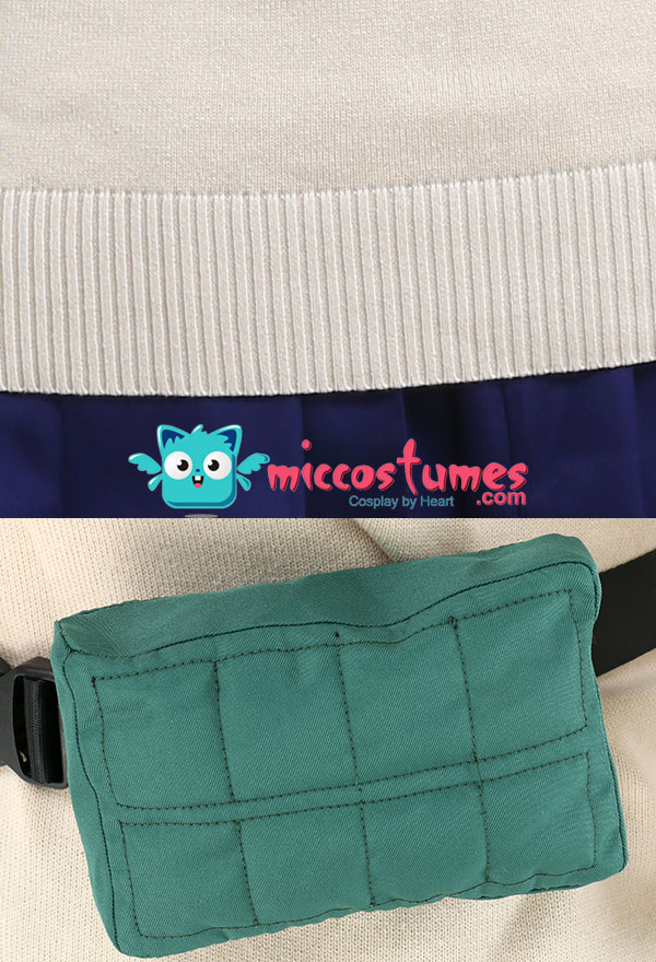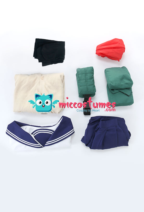 Costume Includes: shirt, skirt, sweater, waist bag*2, thigh bag*2, scarf*1, sock*2. Materials: polyester, lining, PU leather.