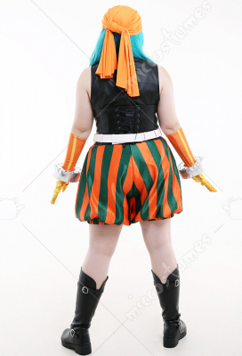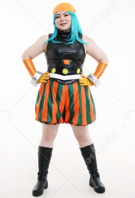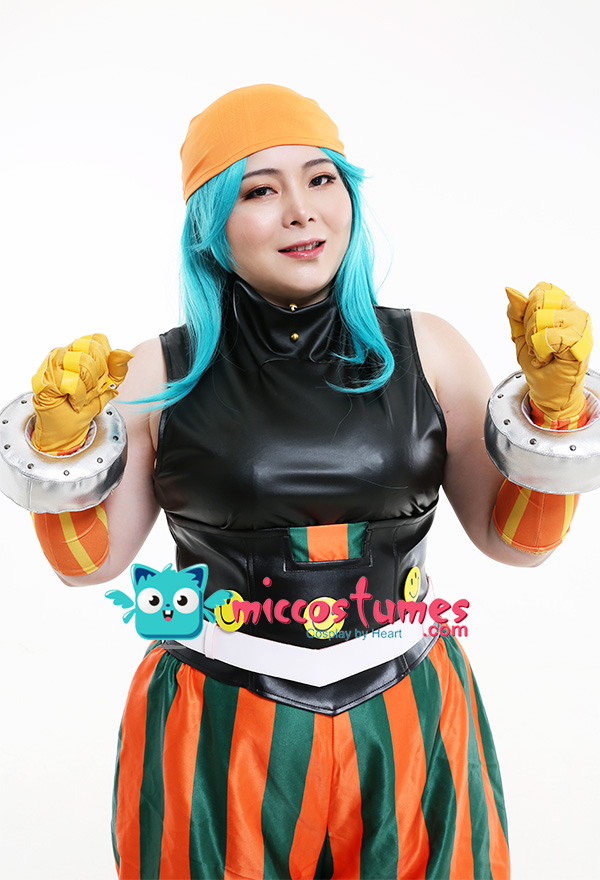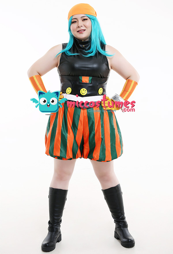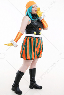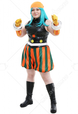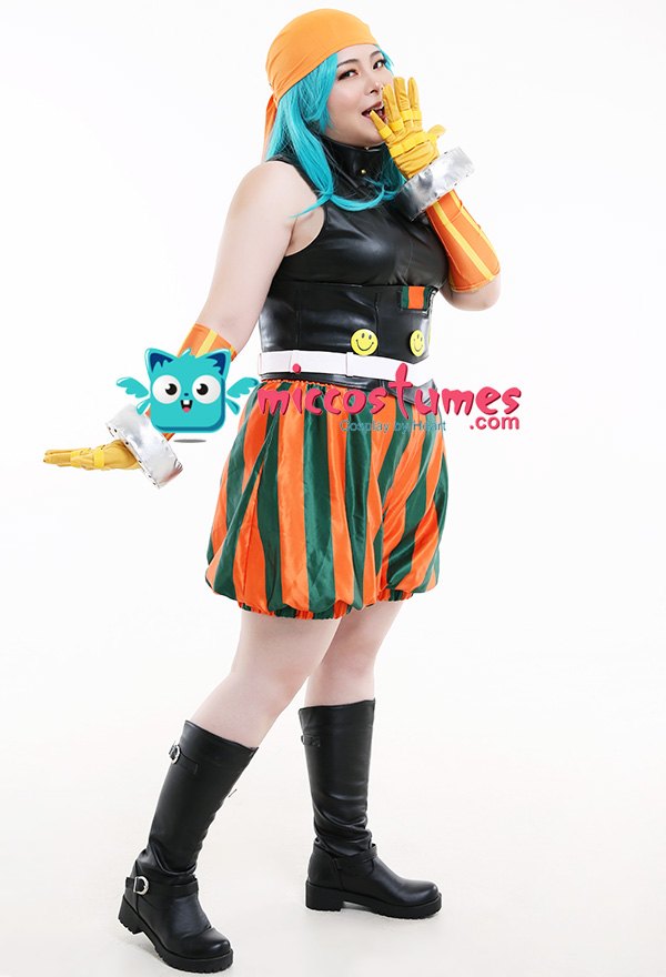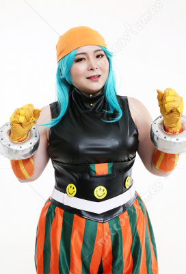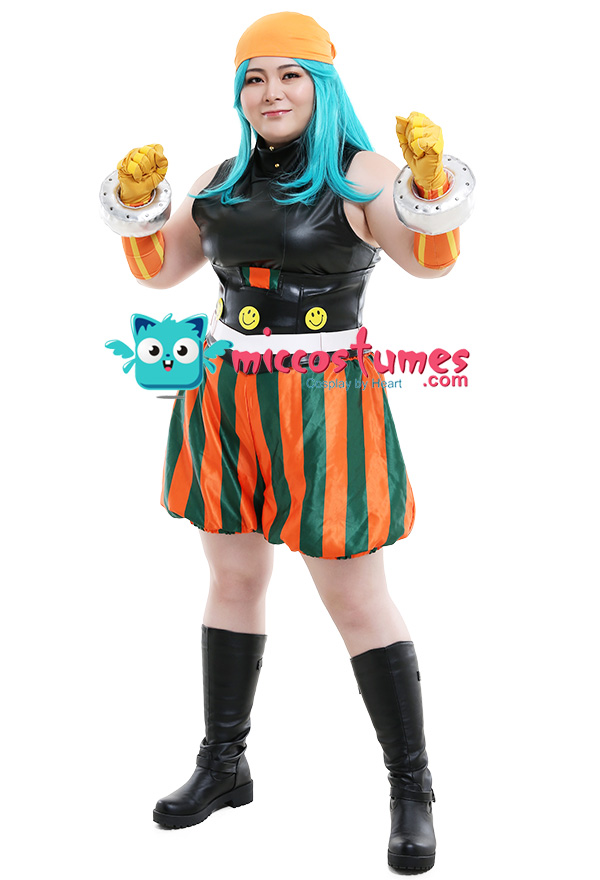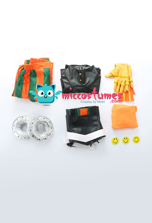 Costume Includes: Inner Coat, Girdle, Pants, kerchief, Belt, Gloves * 2, Hand Accessories * 2, Smiling Face Accessories * 3. Material: milk shreds, PU leather, satin, spandex, reb, cotton, EVA(for hand accessories), rivet, air hole.