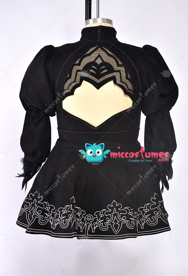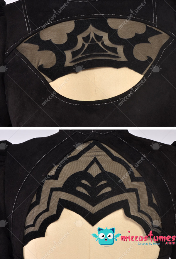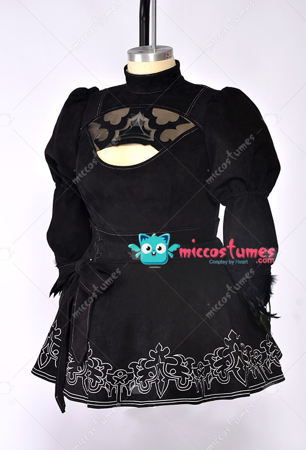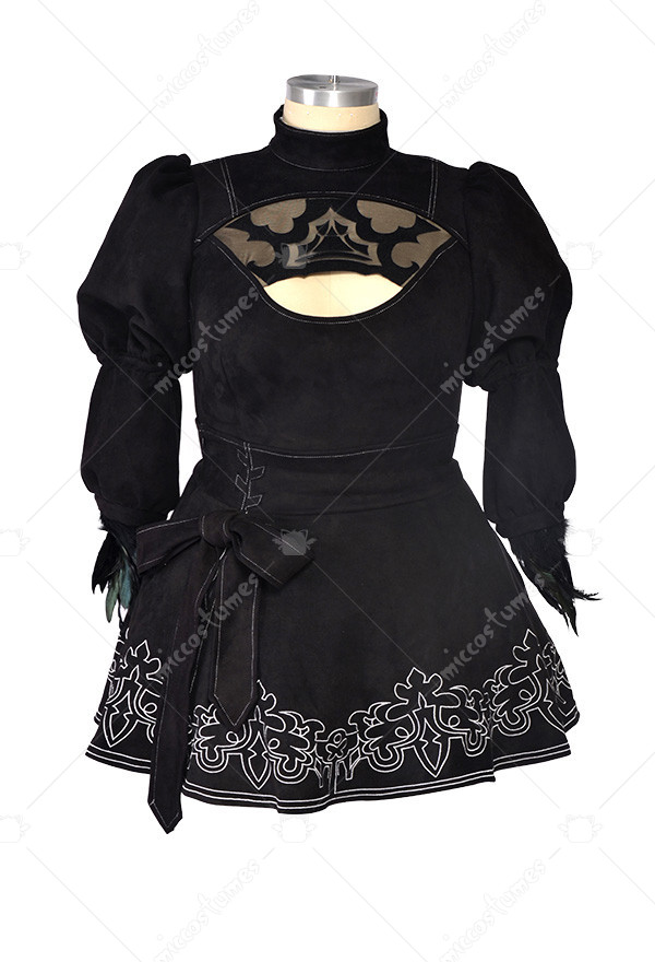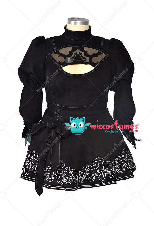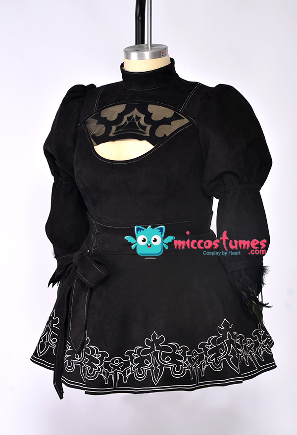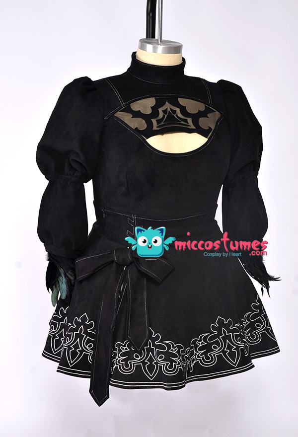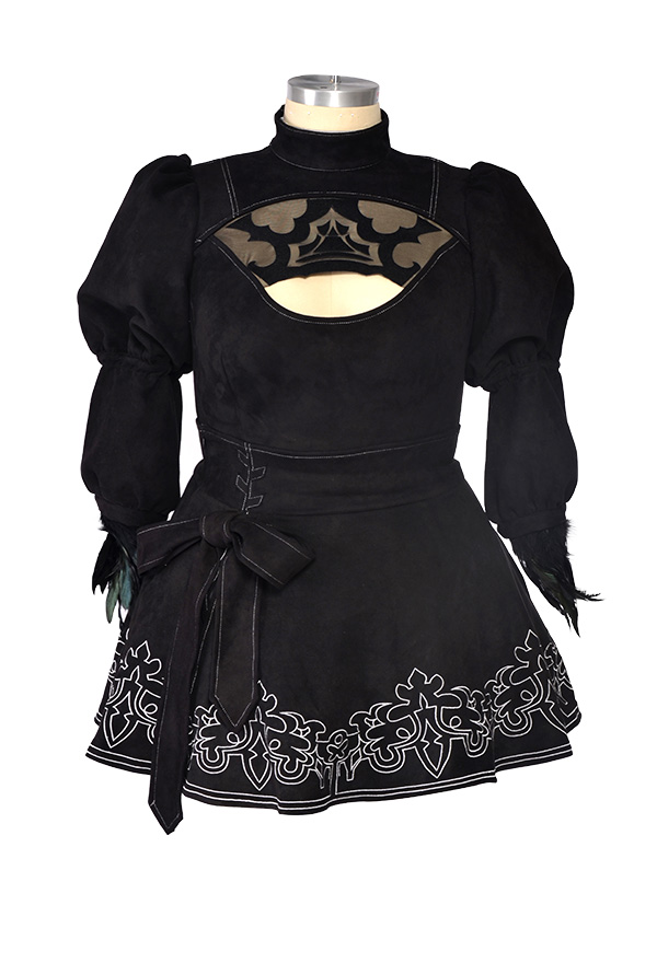 The costume includes jumpsuit, skirt, gloves, blindfold, silk stockings, headband, leather stockings. It is made of elastic faux suede, feathers, spandex, elastic leather.