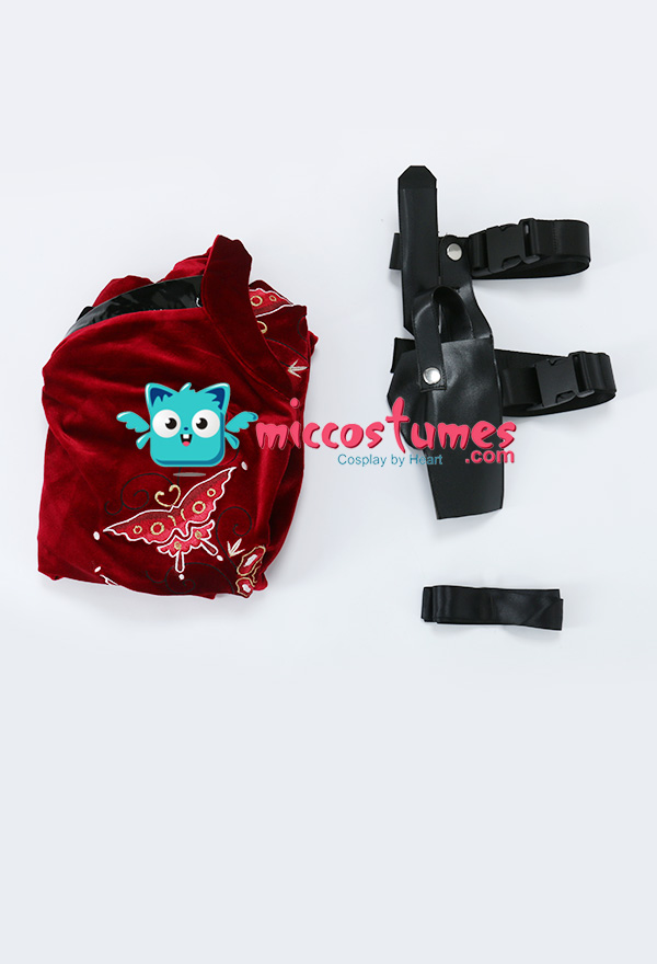 Costume Includes: dress, choker*1, holster*1, dagger scabbard*1. Materials: PU leather, velvet.