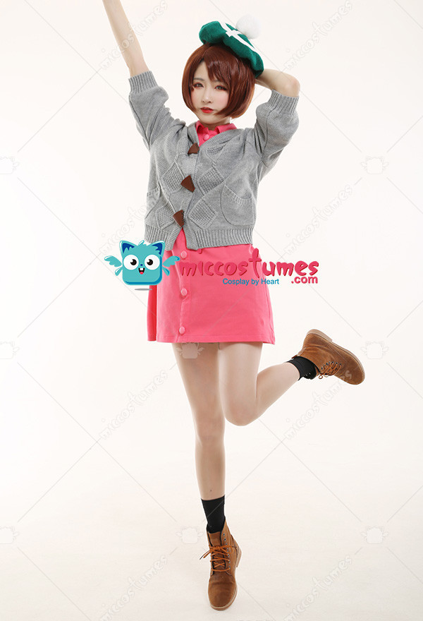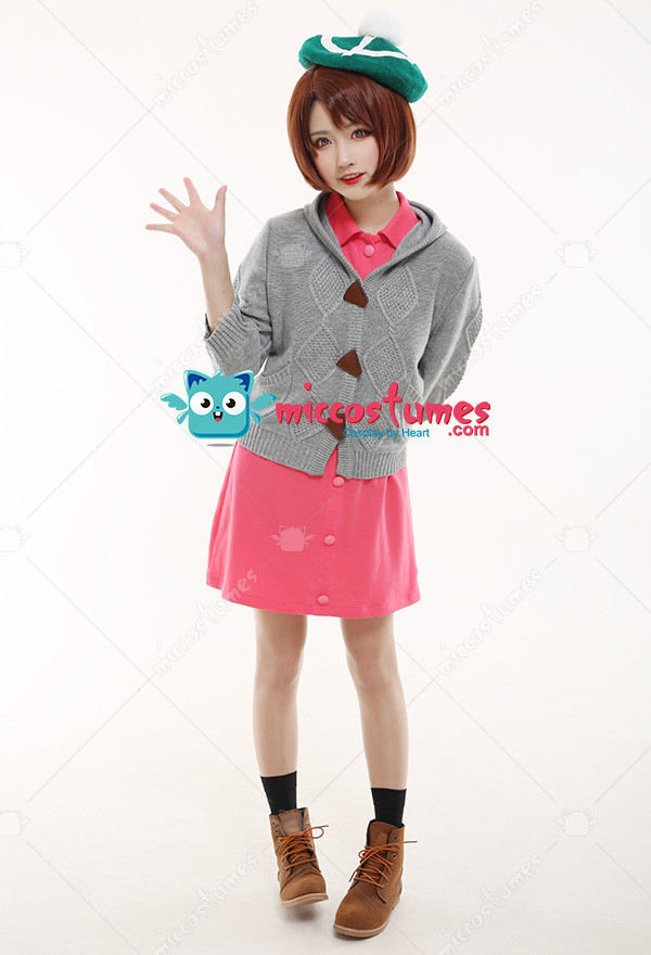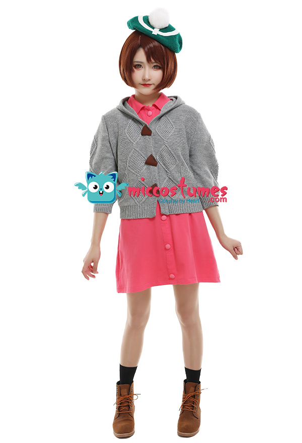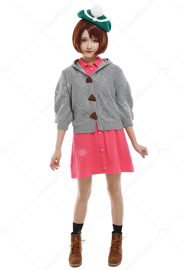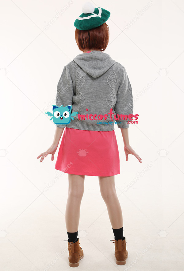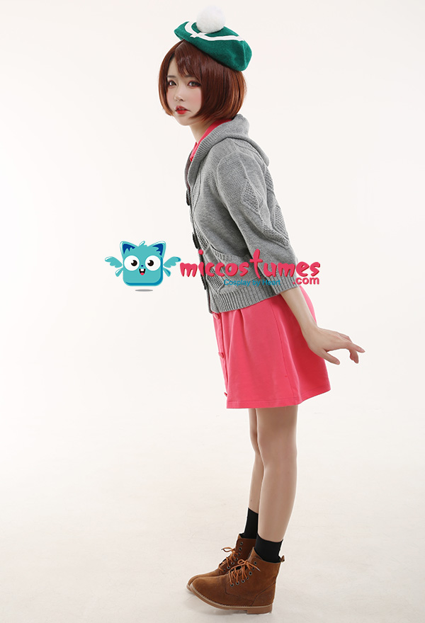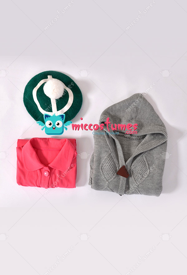 The costume includes coat, dress, beret. It is made of PU leather, knitted fabric.