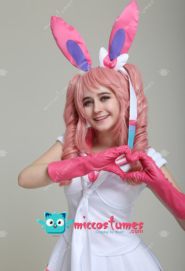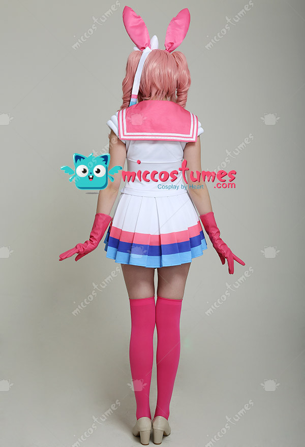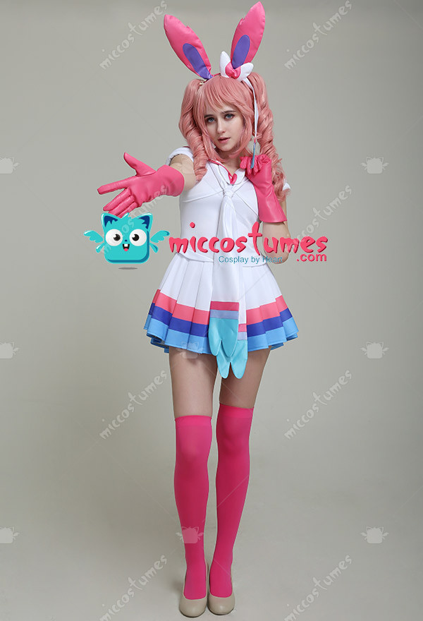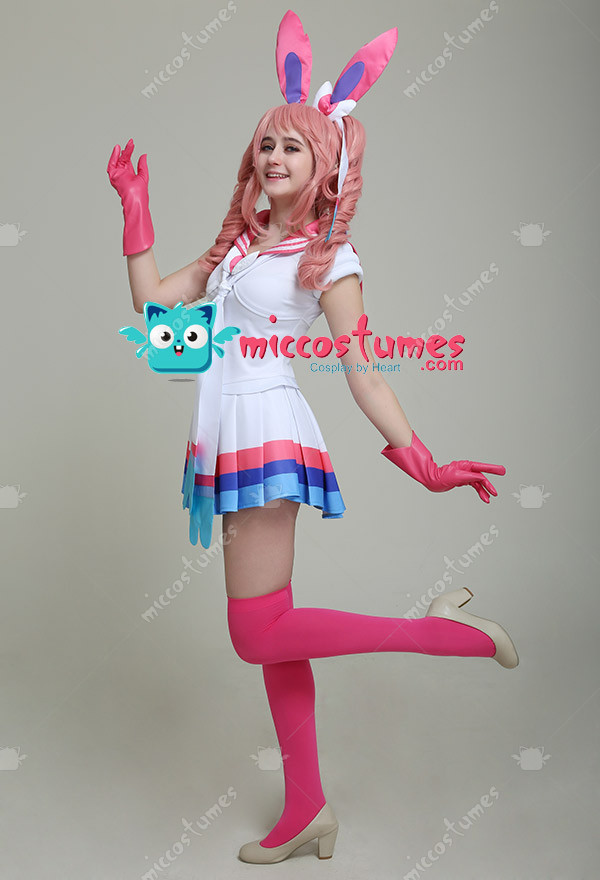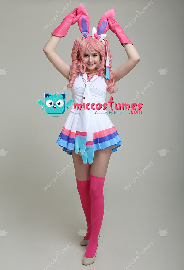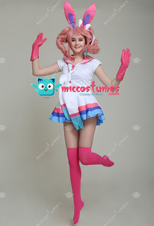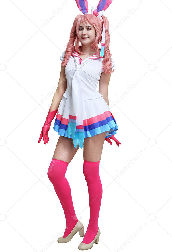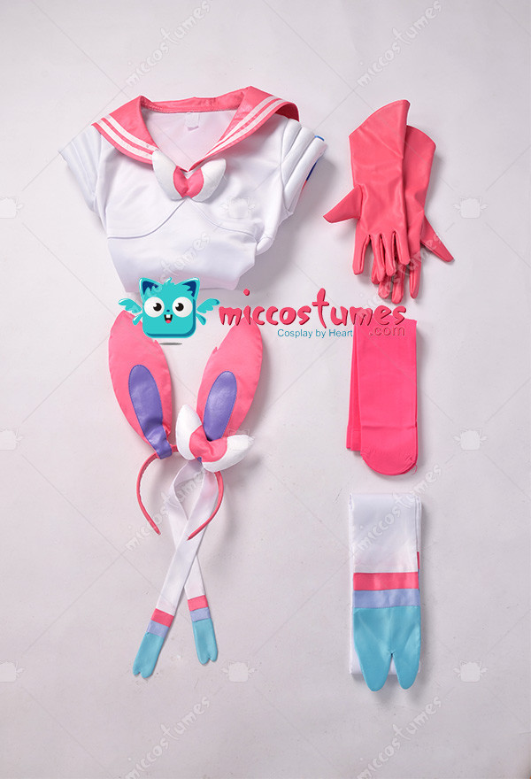 The costume includes hair accessory, dress, glove*2, sock*2, scarf*1. It is made of spandex, PU leather, satin, lining, cotton.