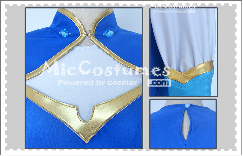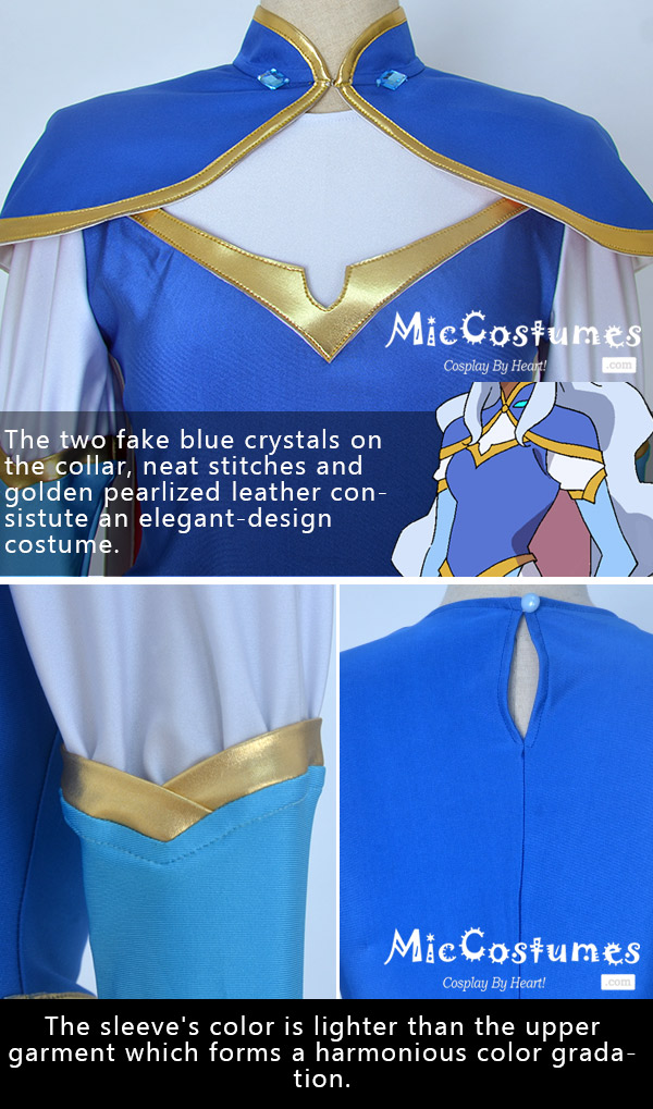 This costume includes upper garment, skirt, cloak, bracelets×2, headdress. It is made of spandex, PU leather, satin.