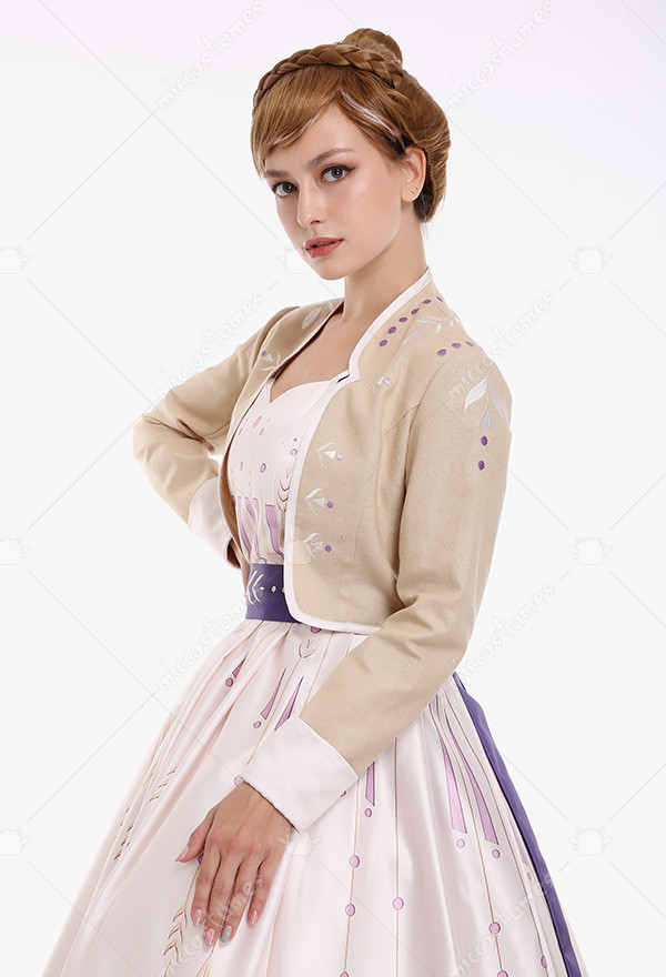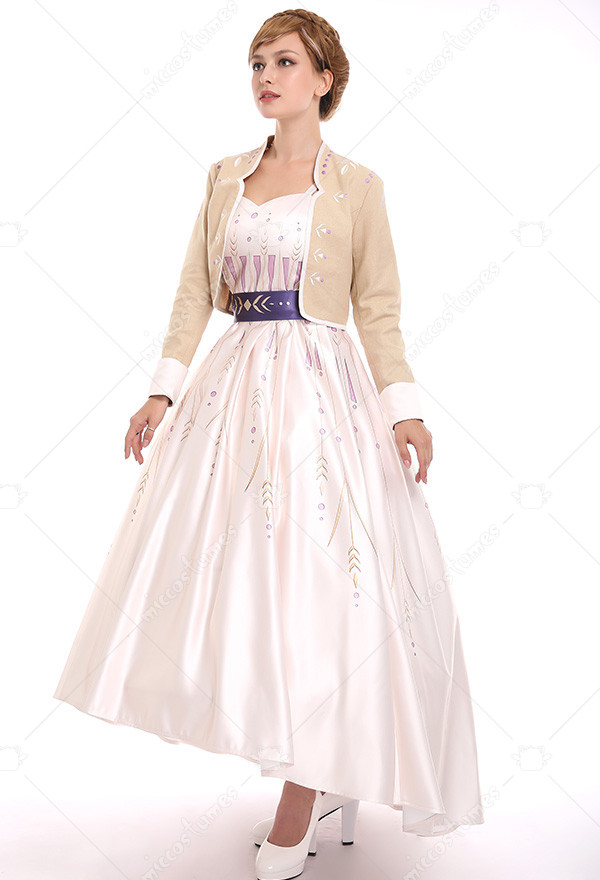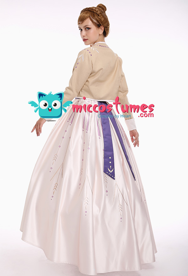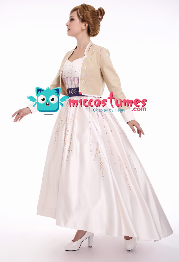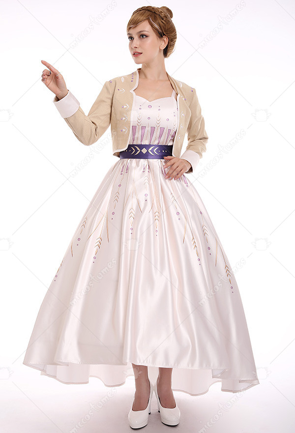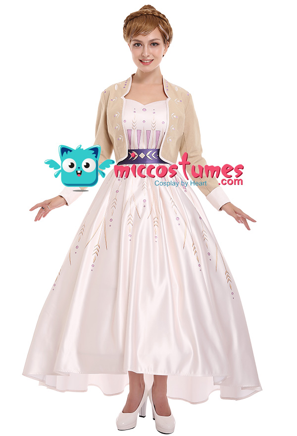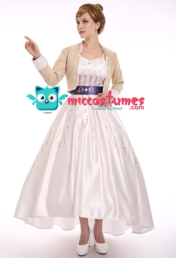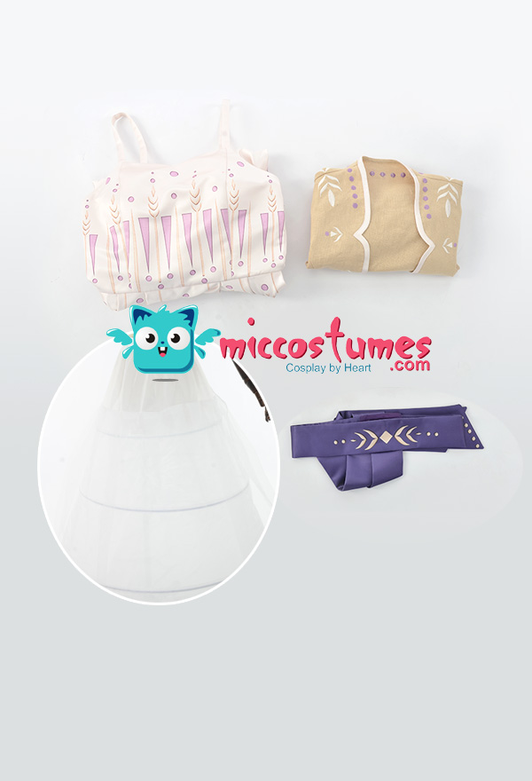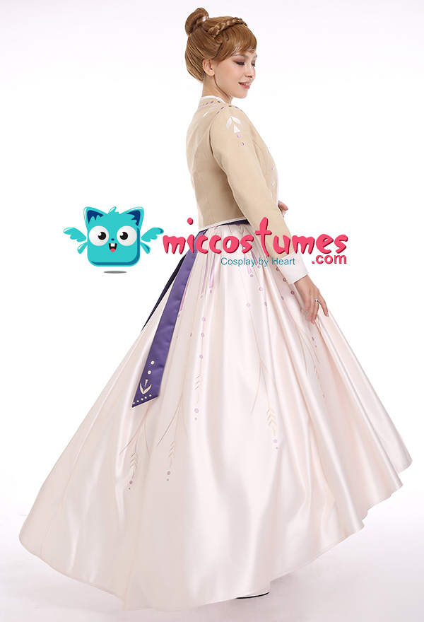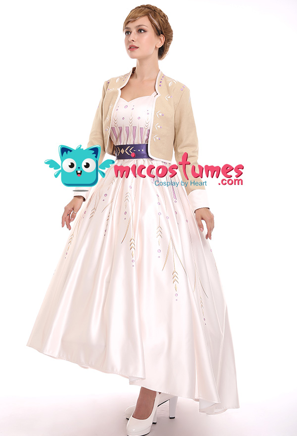 The costume includes coat, dress, belt, petticoat. It is made of spandex, satin, linen fabric.