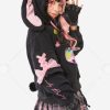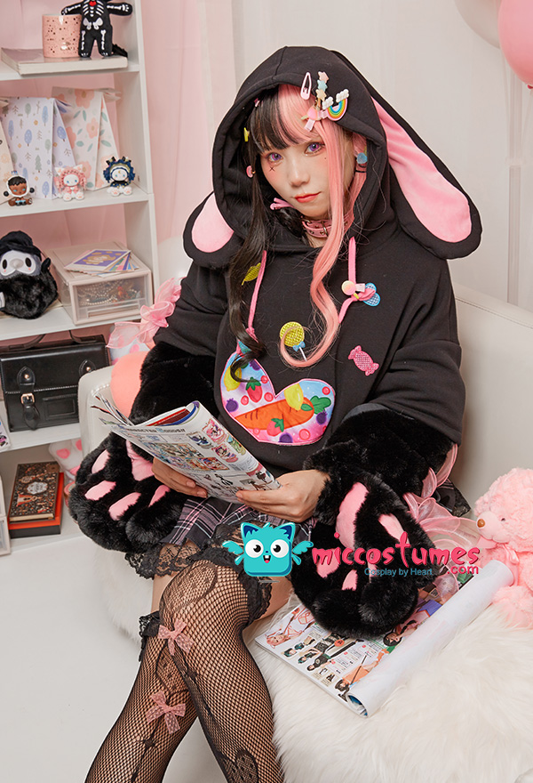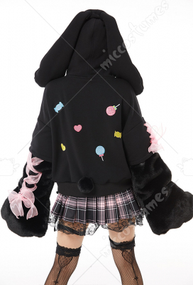 Note: It only includes one hoodie (included two detachable paw gloves and two straps). It doesn't contain any other accessories. We'll randomly give some small clips as the free gifts. Design Details: 1. Inspiration Source – The hoodie is inspired from cat and bunny as the prototype. With the bunny ear hooded and candy print and using black color as the main color, it looks cute and cool. 2. Special Design – The detachable bag design furry paw is the highlight of this hoodie. The two long-sleeved paw gloves can be detached and used as two bags. 3. Soft & Cozy Materials – The main hoodie is made of high-quality sweatshirt fabric, which is breathable, light and comfortable. It’s specially suited for autumn and spring. The paw gloves use furry material which is soft and comfortable. 4. Notes – There may be some floating fluff on the surface of the hoodie. We suggest you clean the stains with wet towel as soon as possible once your hoodie is stained. Please do not wash frequently. It cannot be machine washed. Please do not add any chemical products when washing. For the Paw Gloves Design: 1. The paws are filled with cotton cushions and provided with heart designs to offer a cute and real look. 2. Hidden zippers are provided on the sleeves and inside the gloves’ wrists. You can remove the gloves via the zippers on the sleeves or unzip the gloves’ wrists to let your hands free. 3. The strap on the gloves can be a fashion icon and can also be used to sling the bag design gloves over your shoulders. 4. The material used for gloves is super-soft and cozy to keep your hands always in a warm state.