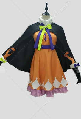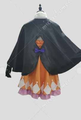 This costume includes cloak, dress, shorts, pantyhose, gloves, small bow, neckline bow, belt, streamers, back bow, velvet straps, hat. It is made of satin, uniform cloth, micro fiber.