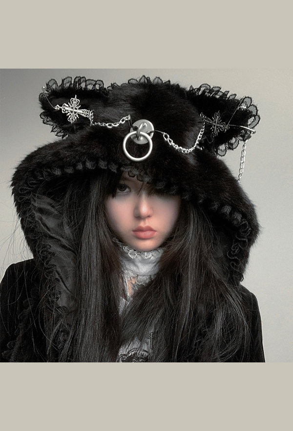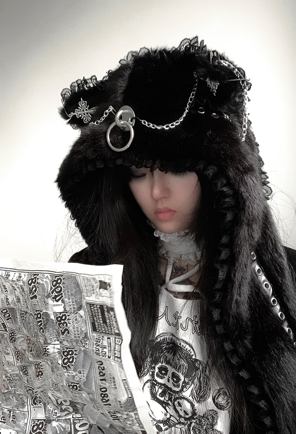 Punk Gothic Dark Style Cute Cat Ear Metal Decoration Trapper Hat Women Warm Long Ear Flap Winter Hat Beanie Cap Headwear with Scarf