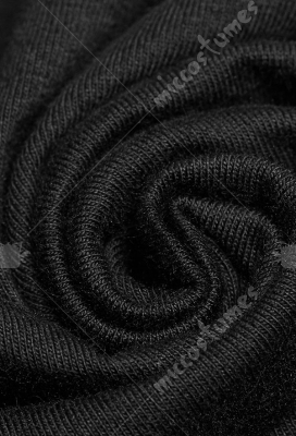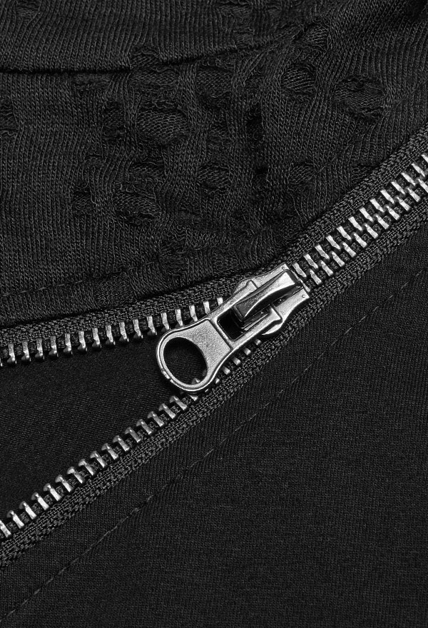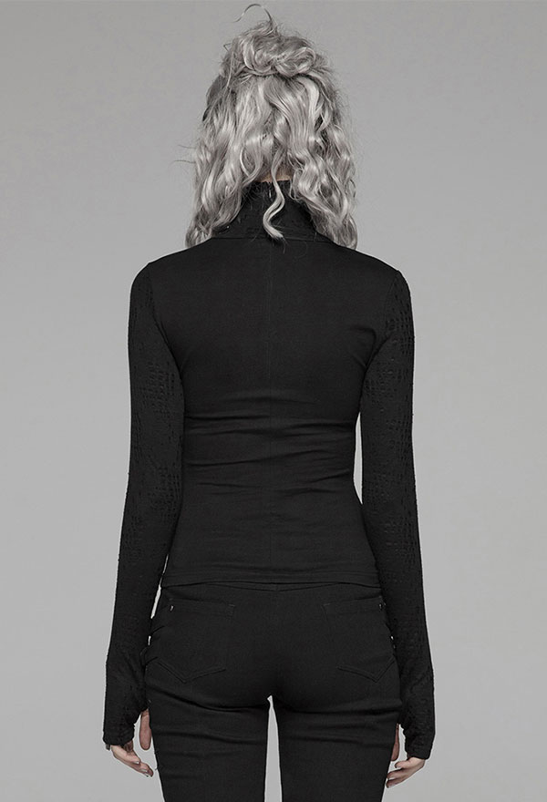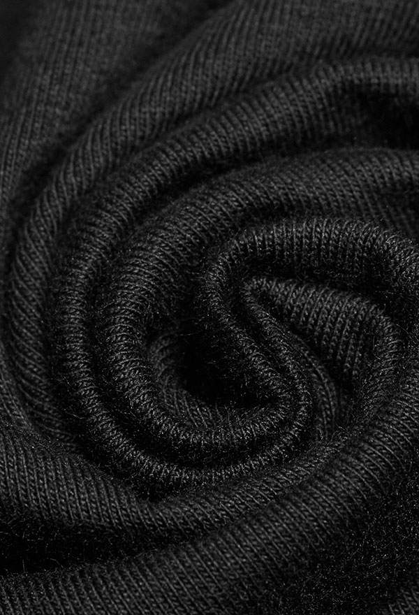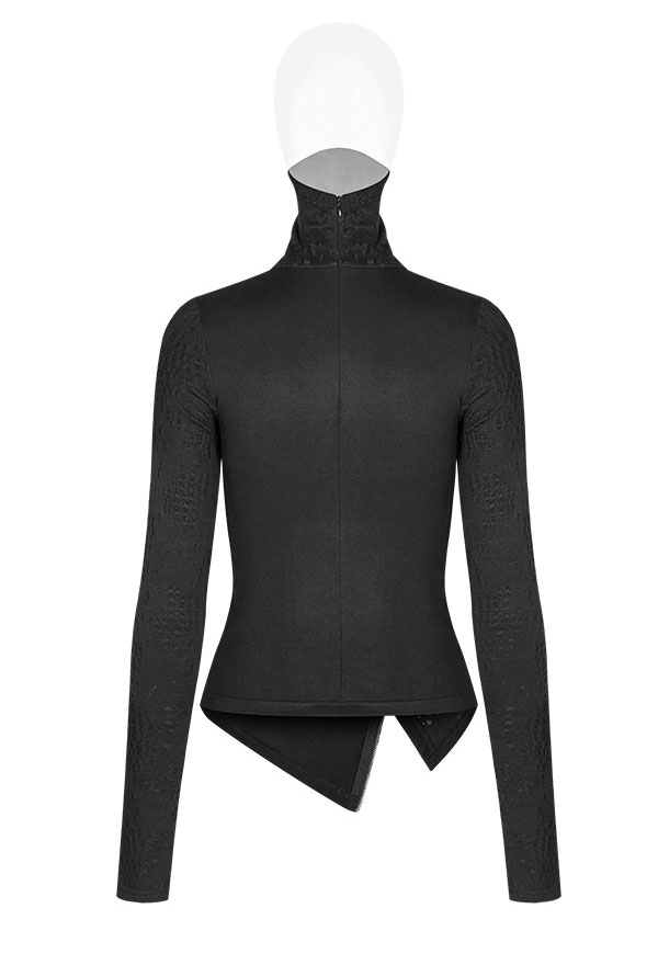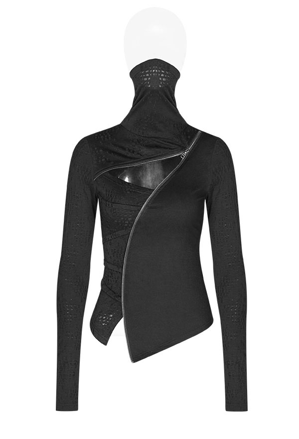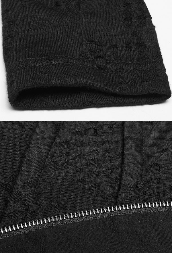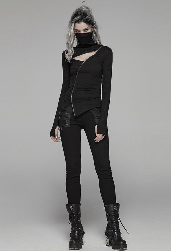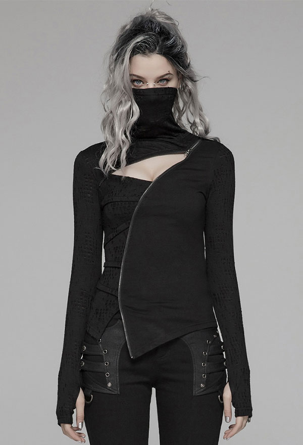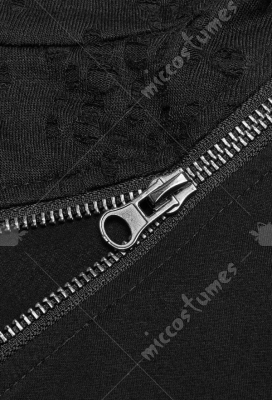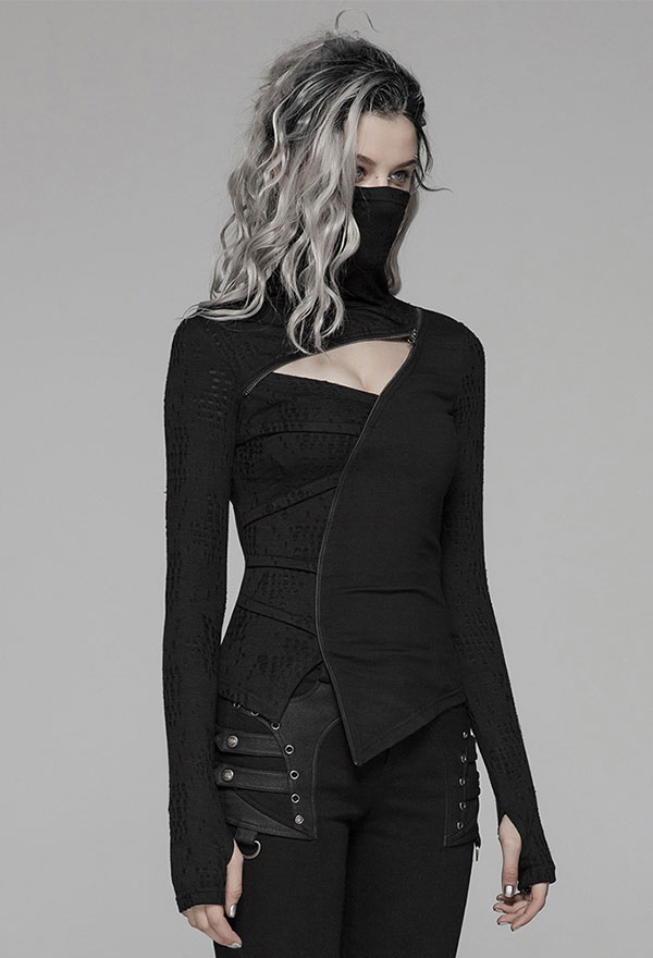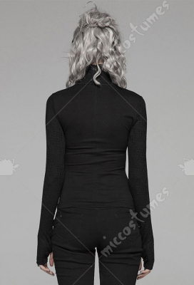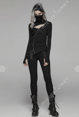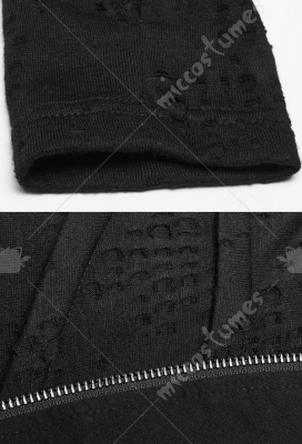 Costume Includes: T-shirt only. Material: knitted fabric. Design Details: The costume is made of knitted fabric with good elasticity, and it is form-fitting. The collar is high enough to cover the mouth, which is similar to a mask. On the back, an invisible zipper is used for taking on and off easily. On the chest, the hollow-out design extends to the right side with irregular pleats. A special opening is designed for each cuff, which makes the sleeves same as gloves.