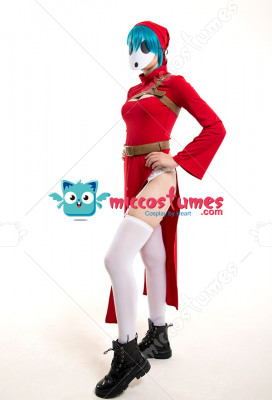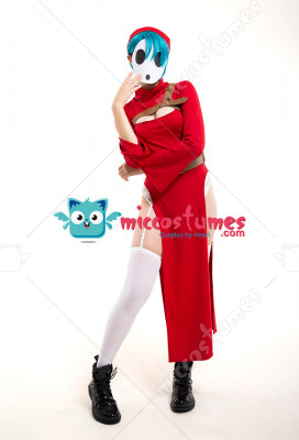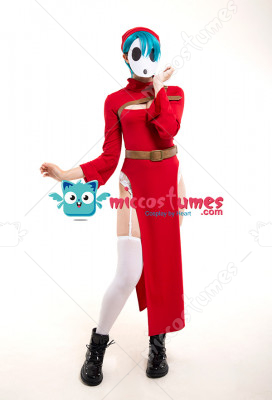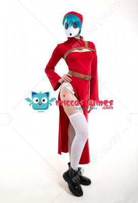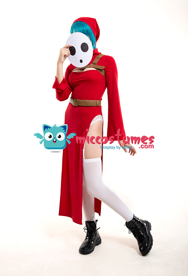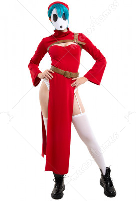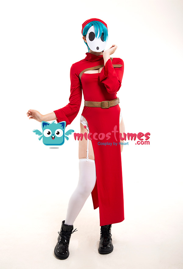 The costume includes dress, belt, hat, chest decoration belt, garters*1, stockings. It is made of PU leather, scuba fabric, EVA.