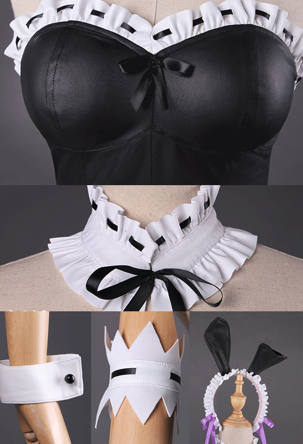This costume includes: strapless jumpsuit, apron, hairband, neckwear, armlets×2, wrist guards×2, stockings. It made of PU leather.