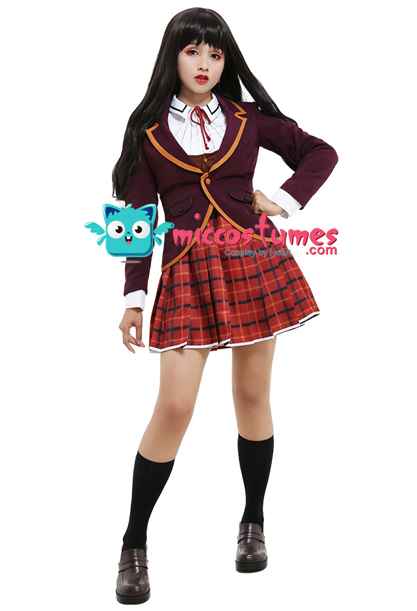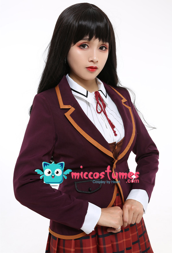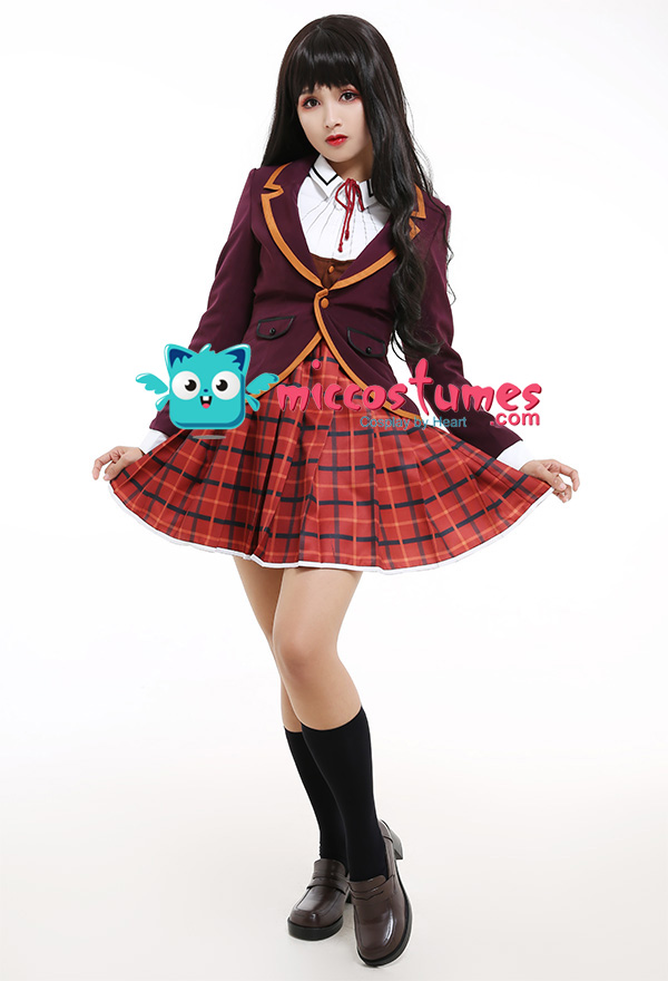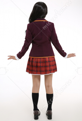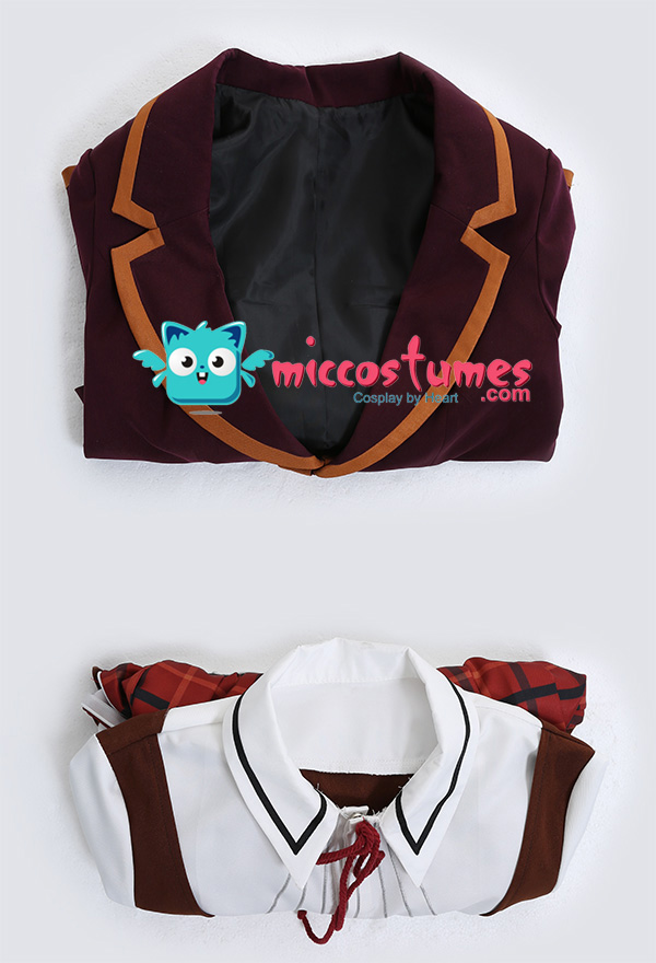 Costume Includes: shirt with strap dress, school uniform. Material: uniform cloth, polyester. Design Details: The costume is made of uniform cloth, with printed design. The shirt and suspender dress are designed as fake-two form, and the front chest is sewn with color-contrast ribbon.