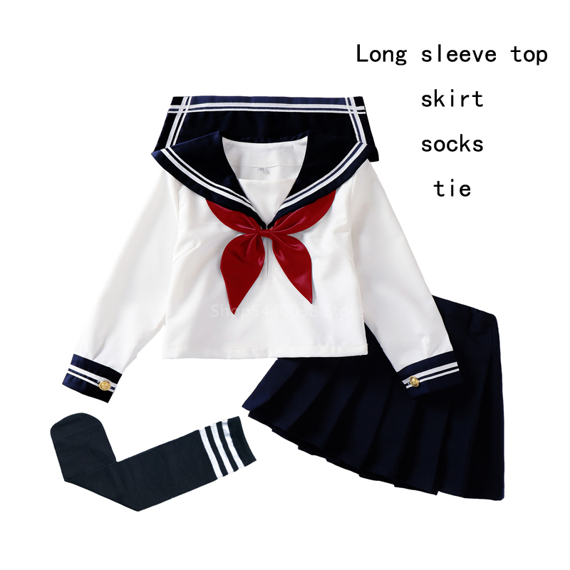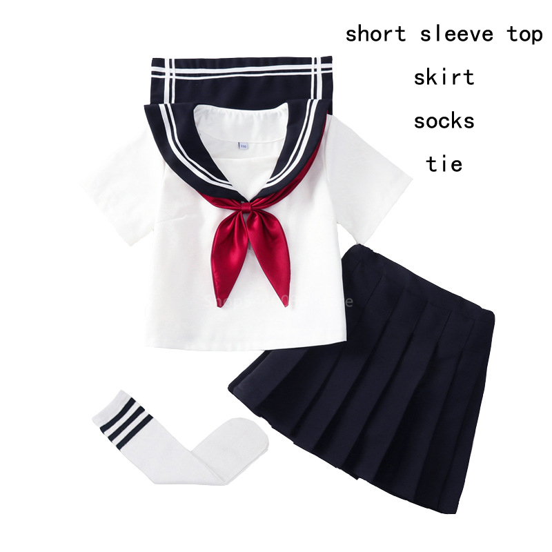 Kid JK Sailor Dress 4PCS Girl Japanese Korean Orthodox School Uniform Pleated Skirt Navy Long Short Sleeve Kawaii Suit Anime COS