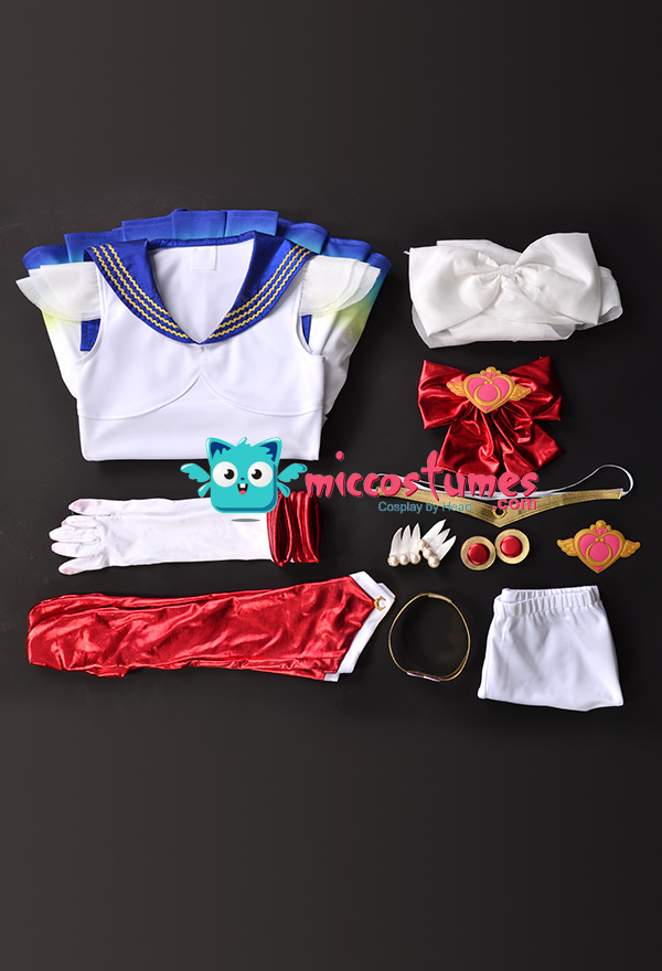 The costume includes dress, glove*2, shoes cover*2, frontlet*1, necklace*1, safety pants*1, hair accessories(red*2, white*2), bowknot*2, badge*1. It is made of spandex, PU leather, linning cloth, net, scuba fabric, Fil-Lumiere cotton, organza, PVC, EVA.