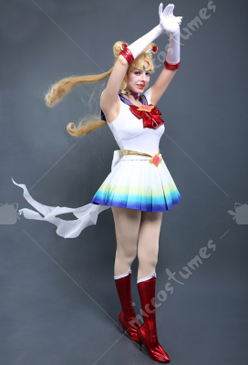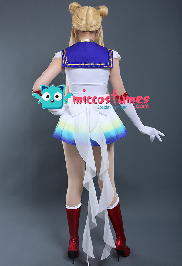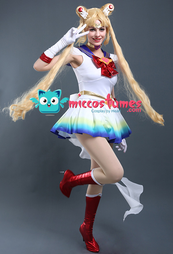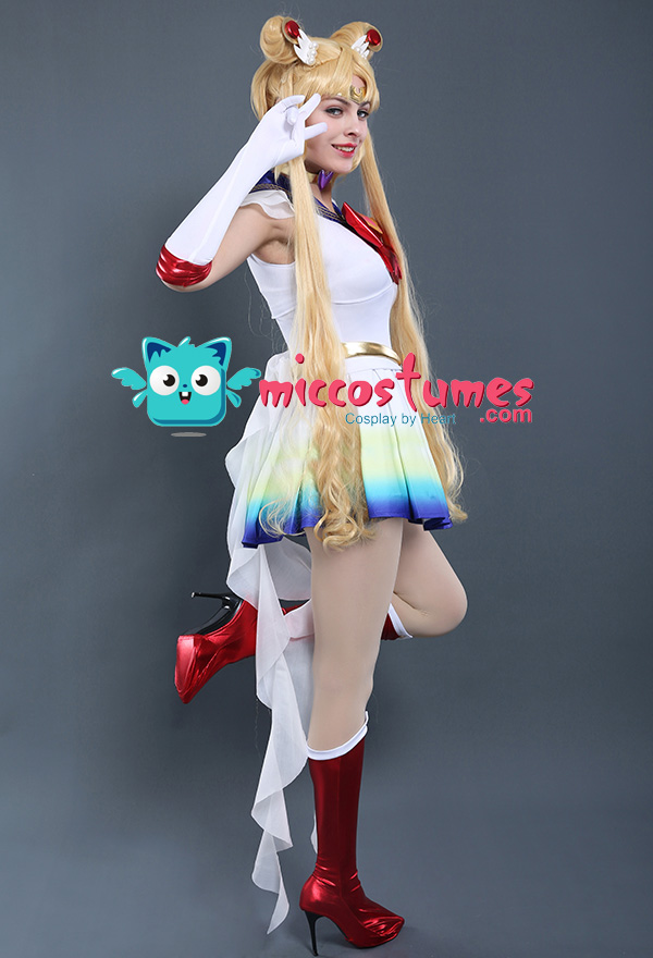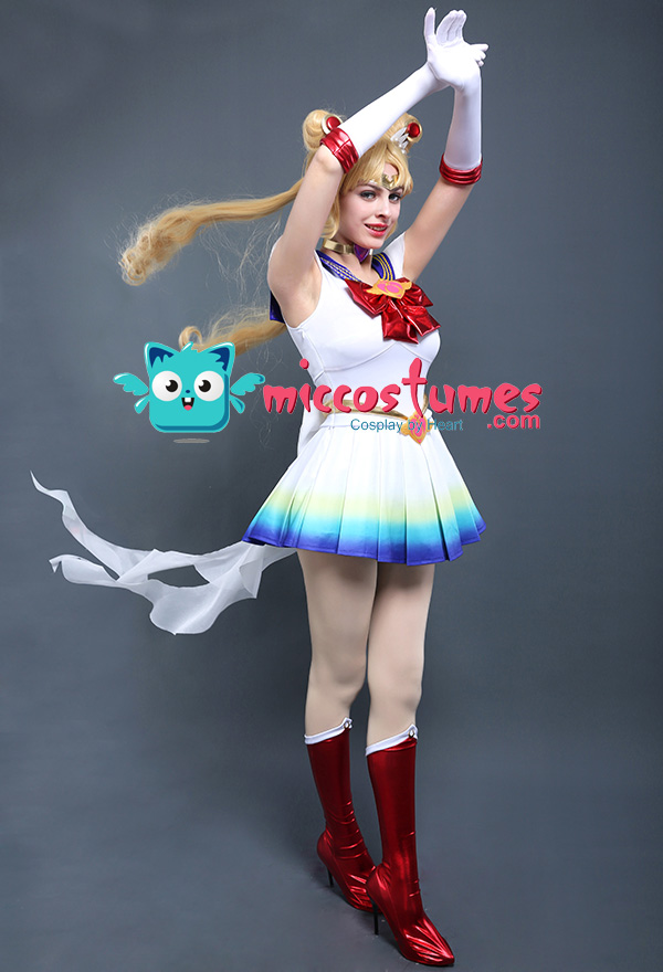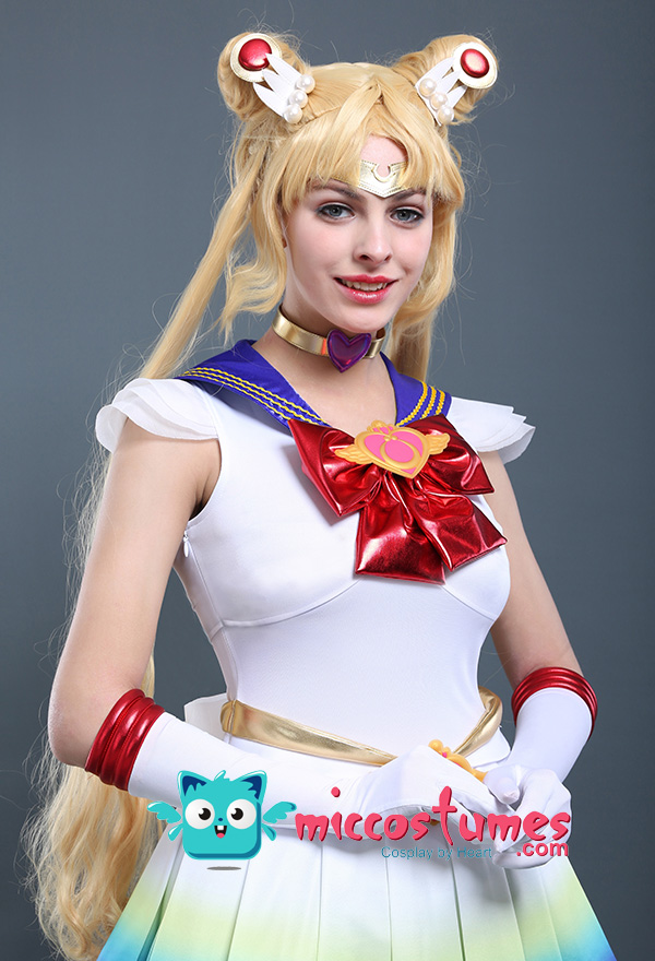 The costume includes dress, glove*2, shoes cover*2, frontlet*1, necklace*1, safety pants*1, hair accessories(red*2, white*2), bowknot*2, badge*1. It is made of spandex, PU leather, linning cloth, net, scuba fabric, Fil-Lumiere cotton, organza, PVC, EVA.