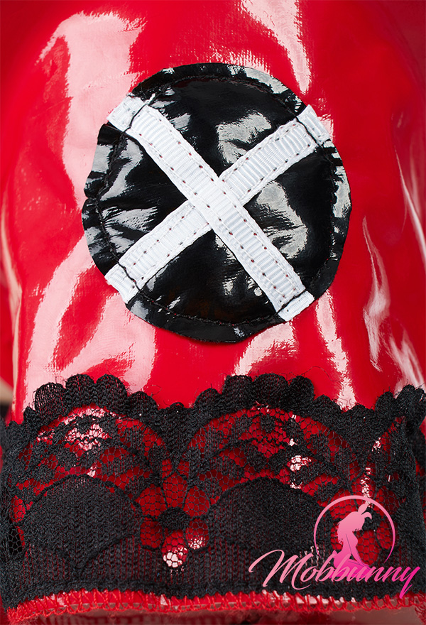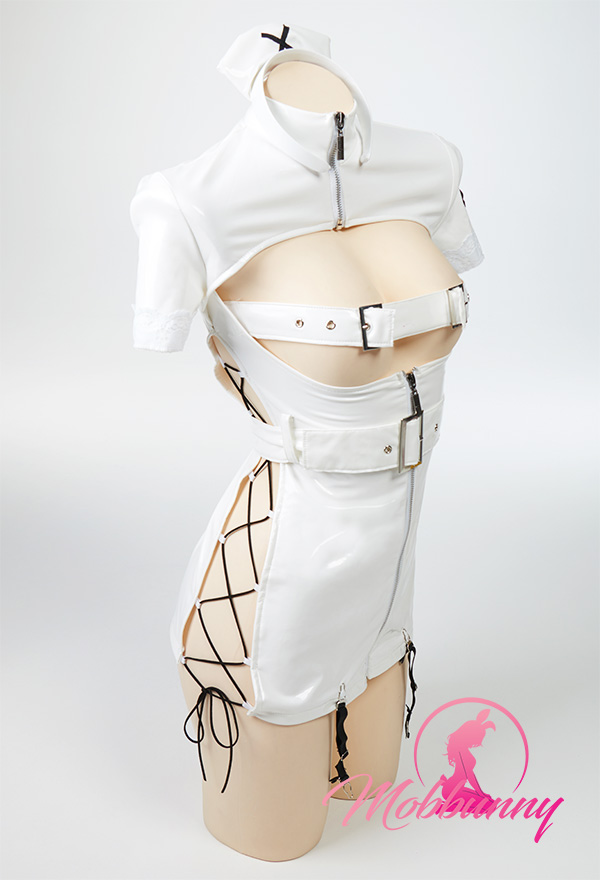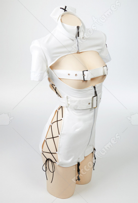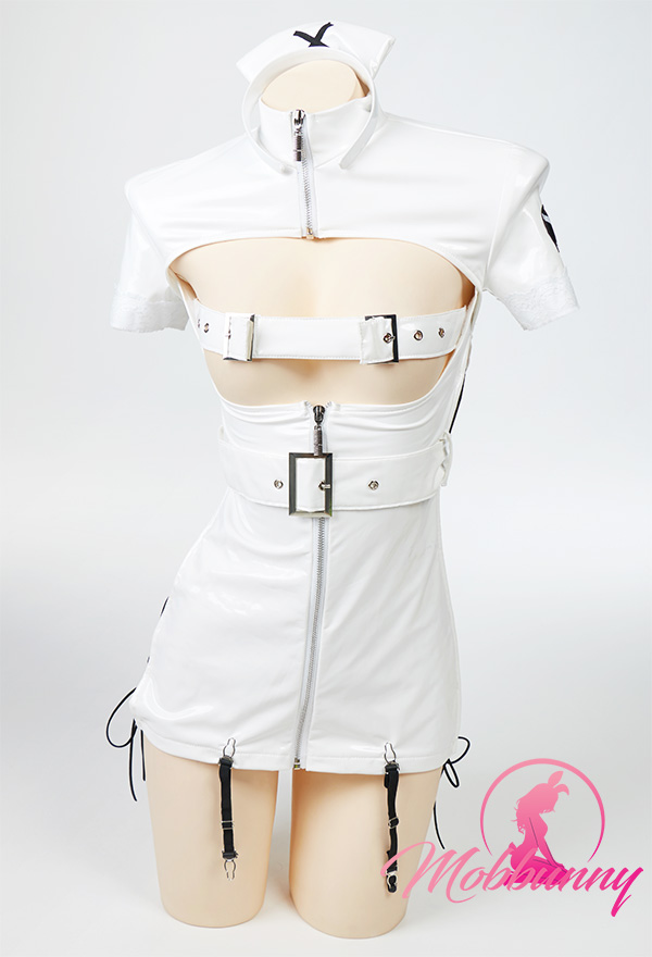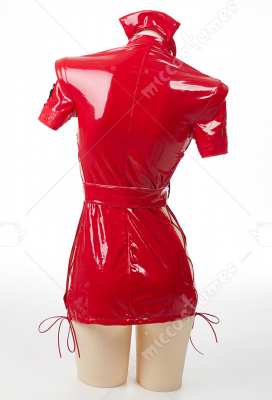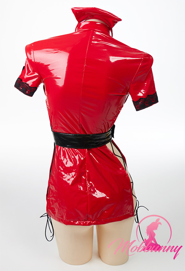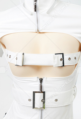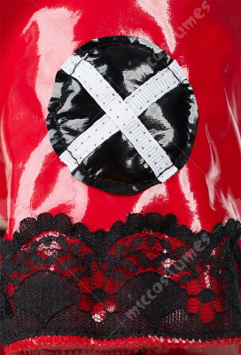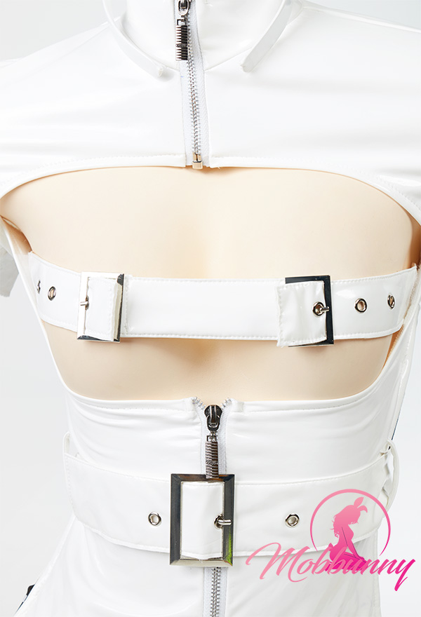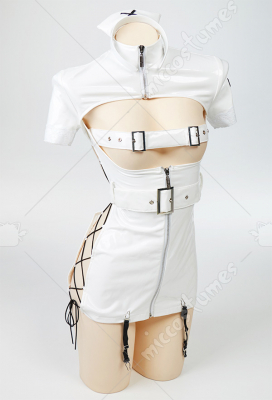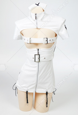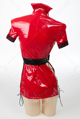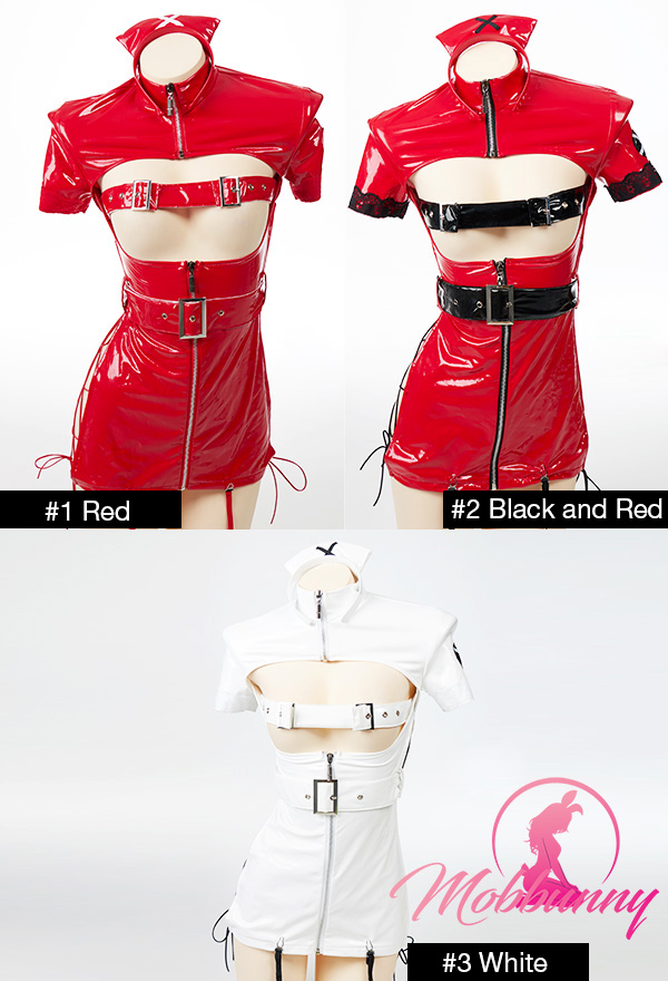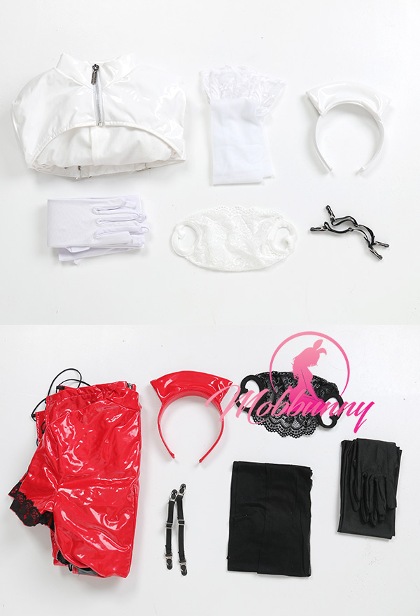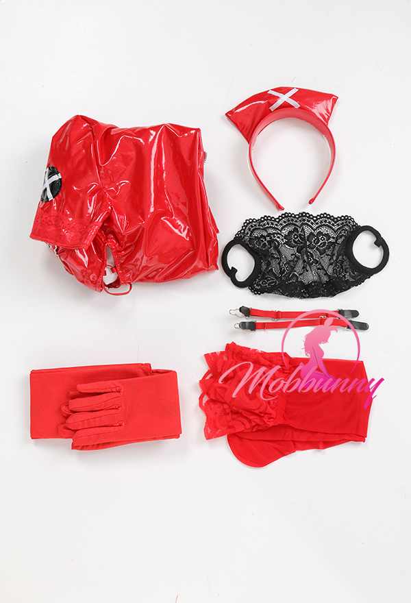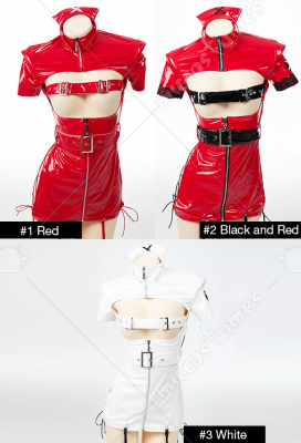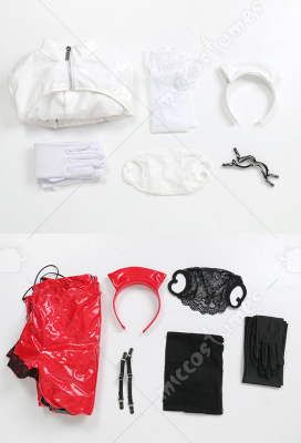 Costume Includes: dress, headwear, belt, face mask, gloves, stockings, hose clamp. Material: shiny leather. Design Details: The strap on the chest is affixed to the clothes with velcro and can be removed, can adjust the position. Cords on either side of a skirt can also be adjusted.