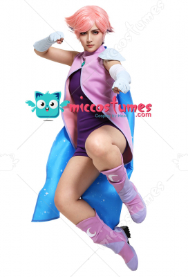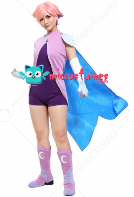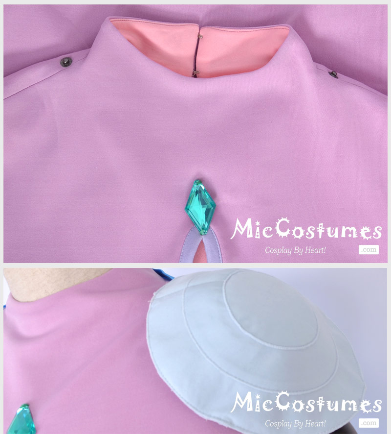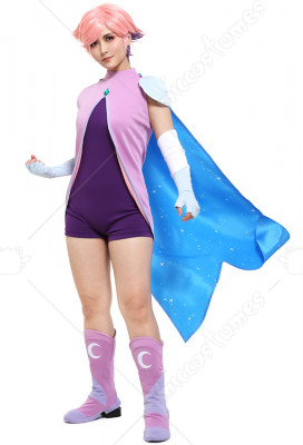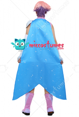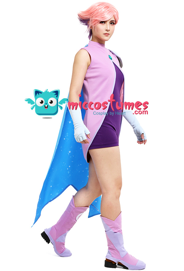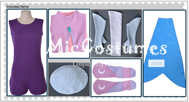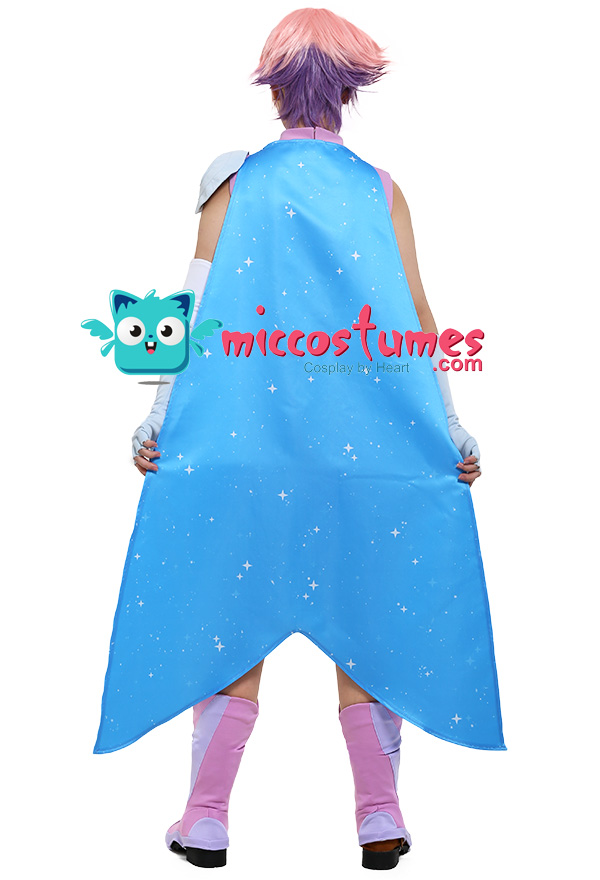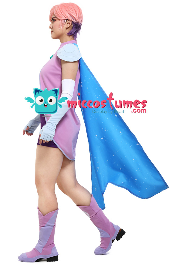 The costume includes upper garment, bodysuit, cape, gloves×2, handsleeve×1, shoe covers×2, shoulder accessory×1. It is made of satin, scuba knit fabric.